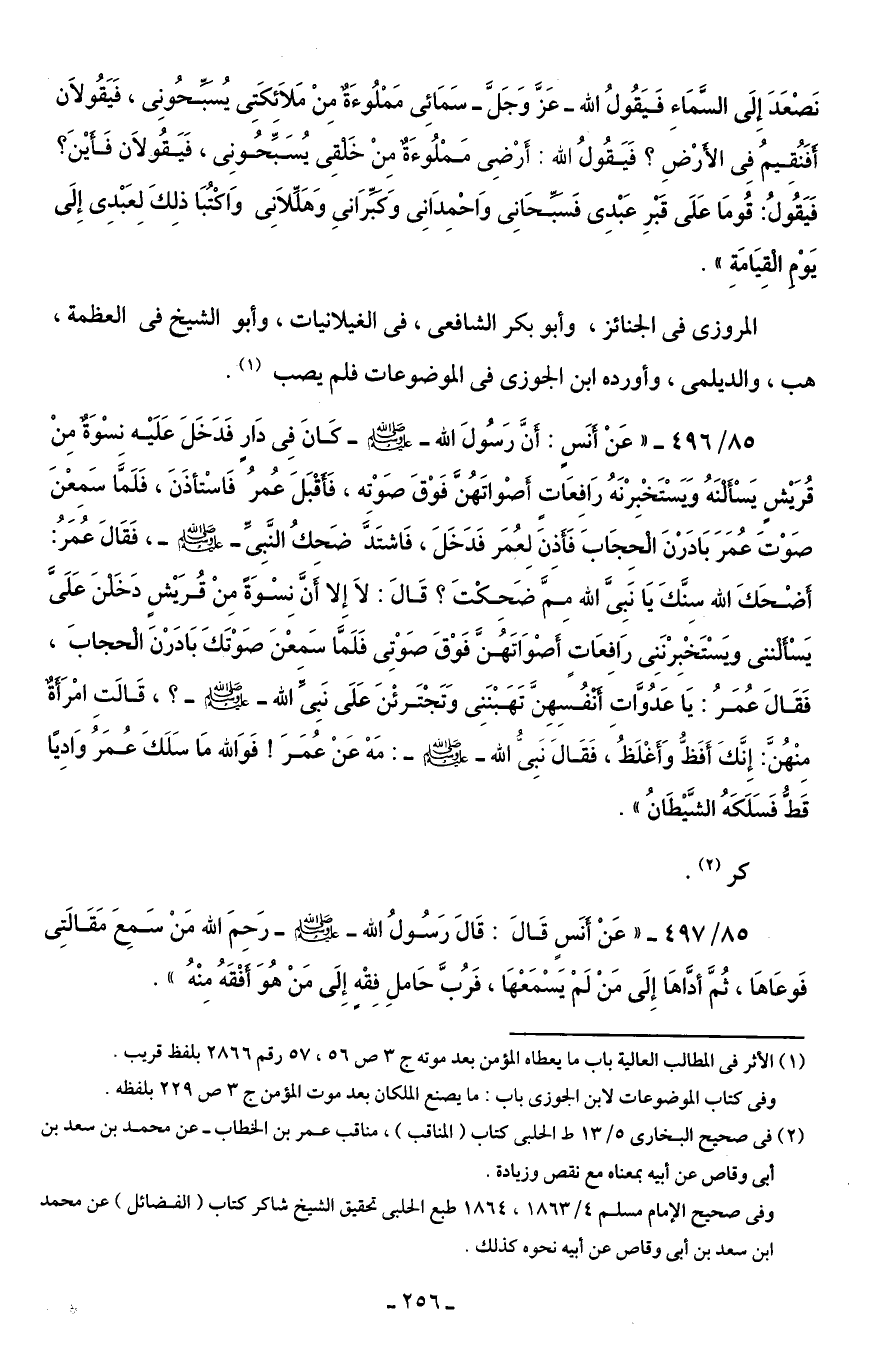 85/ 496 - "عَنْ أَنَسٍ: أنَّ رَسُولَ الله - صلى الله عليه وسلم - كَانَ في دَار فَدَخَلَ عَلَيْه نسْوَةٌ مِنْ قُرَيْشٍ يَسألْنَهُ وَيَسْتَخْبِرْنَهُ رَافِعَاتٍ أَصْواتَهُن فَوْقَ صَوْته، فَأَقْبَلَ عُمرُ فَاسْتأذَنَ، فَلَمَّا سَمِعْنَ صَوْتَ عُمَرَ بَادَرْنَ الْحِجَابَ فَأَذِنَ لِعُمَر فَدَخَلَ، فَاشتَدَّ ضَحِكُ النَّبِيِّ - صلى الله عليه وسلم -، فَقَالَ عُمَرُ: أَضْحَكَ الله سِنَّكَ يَا نَبِىَّ الله مِمَّ ضَحِكْتَ؟ قَالَ: لاَ إِلا أنَّ نِسْوَةً مِنْ قُرَيْشٍ دَخَلنَ عَلَىَّ يَسْأَلْننى ويَسْتَخْبِرْنَنِى رَافِعَاتٍ أصْوَاتَهُنَّ فَوْقَ صَوْتِى فَلَمَّا سَمعْنَ صَوْتَكَ بَادَرْنَ الْحجابَ، فَقَالَ عُمَرُ: يَا عَدُوَّاتِ أَنفُسِهِنَّ تَهَبْنَنِى وَتَجْتَرئْنَ عَلَى نَبِىِّ الله - صلى الله عليه وسلم -؟ ، قَالَتِ امْرَأَةٌ مِنْهُنَّ: إِنَّكَ أَفَظُّ وَأَغْلَظُ، فَقَالَ نَبِىُّ الله - صلى الله عليه وسلم -: مَهْ عَنْ عُمَرَ! فَوَالله مَا سَلَكَ عُمَرُ وَادِيًا قَطُّ فَسَلَكَهُ الشَّيْطَانُ".