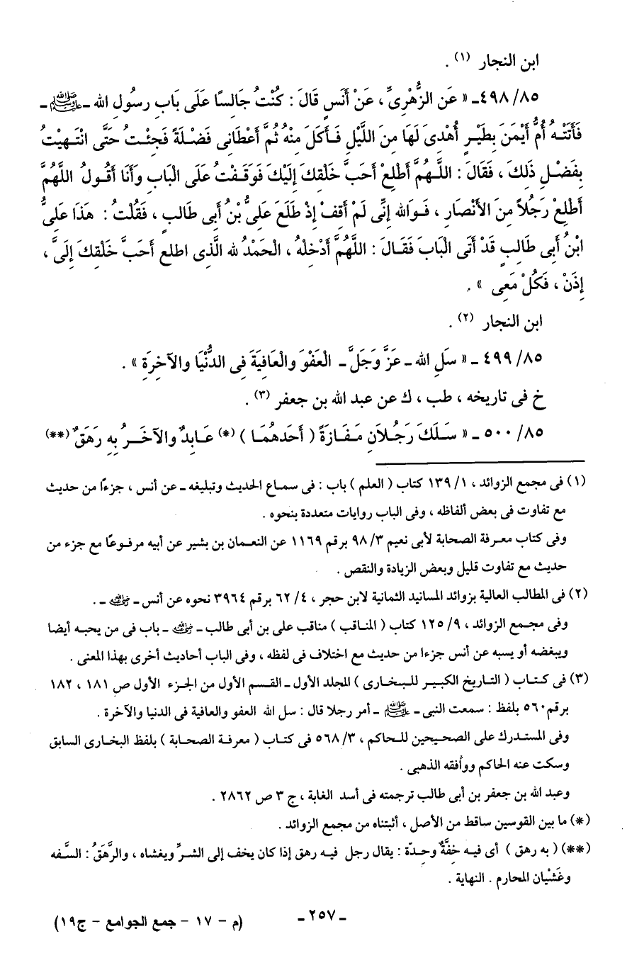 85/ 498 - "عَن الزُّهْرِيِّ، عَنْ أَنَسٍ قَالَ: كنتُ جَالِسًا عَلَى بَابِ رسُولِ الله - صلى الله عليه وسلم - فَأَتَتْهُ أُمُّ أيْمَنَ بِطَيْرٍ أُهْدىَ لَهَا مِنَ اللَّيْلِ فَأكَلَ مِنْهُ ثُمَّ أعْطَانِى فَضْلَةً فَجِئْتُ حَتَّى انْتَهيْتُ بفَضْلِ ذَلِكَ، فَقَالَ: اللَّهُمَّ أَطْلِعْ أَحَبَّ خَلقِكَ إِلَيْكَ فَوَقَفْتُ عَلَى الْبَاب وَأَنَا أَقُولُ اللَّهُمَّ أَطلِعْ رَجُلًا مِنَ الأنْصَارِ، فَوَالله إِنِّى لَمْ أَقفْ إِذْ طَلَعَ عَلِيُّ بْنُ أبِى طَالبٍ، فَقُلتُ: هَذَا عَلِىُّ ابْنُ أبِى طَالِبٍ قَدْ أَتَى الْبَابَ فَقَالَ: اللَّهُمَّ أَدْخِلهُ، الْحَمْدُ لله الَّذِى اطلع أَحَبَّ خَلقِكَ إِلَىَّ، إِذَنْ، فَكُلْ مَعِى".