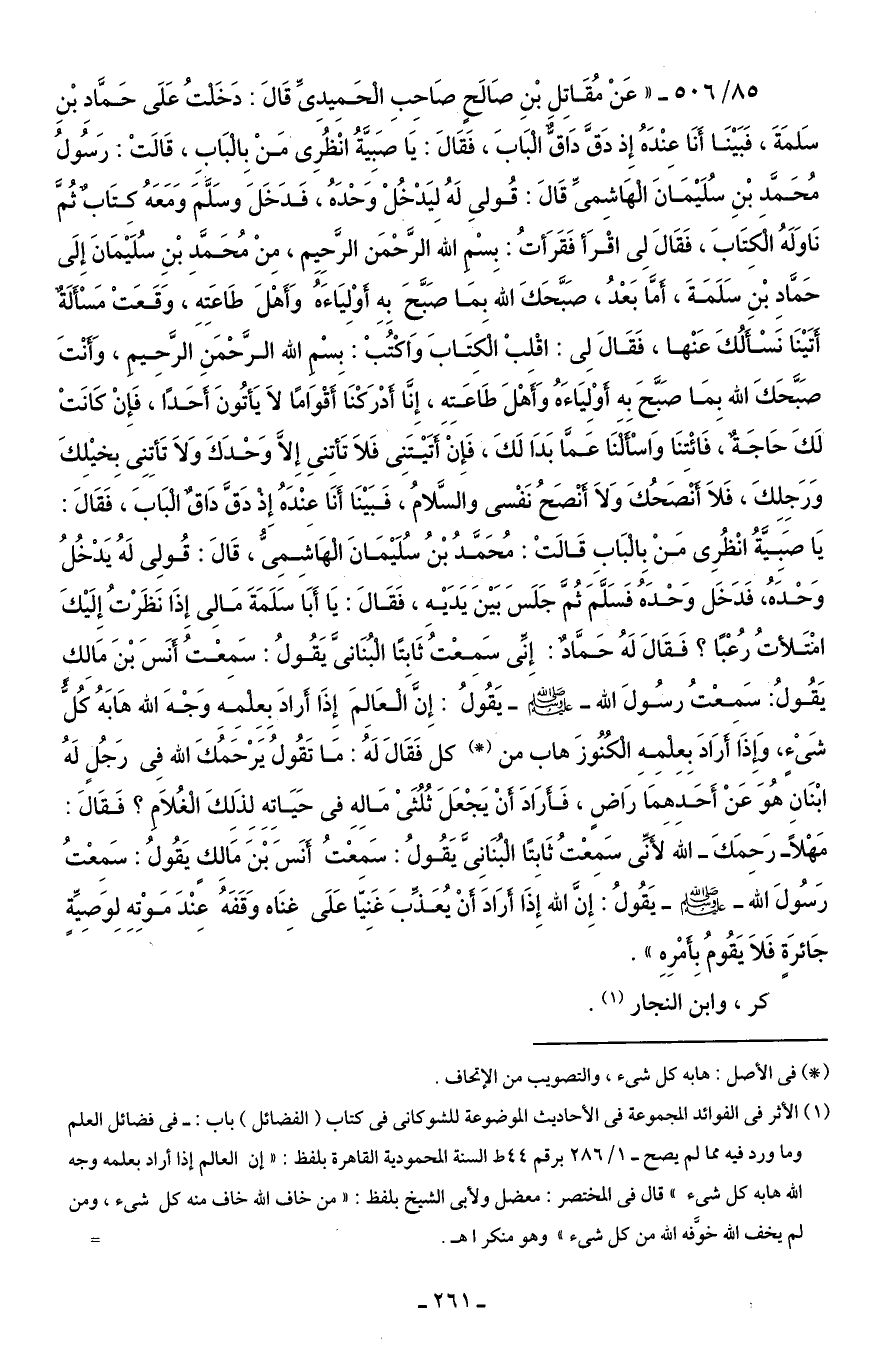 85/ 506 - "عَنْ مُقَاتِل بْنِ صَالَحٍ صَاحِبِ الْحَمِيدِى قَالَ: دَخَلتُ عَلَى حَمَّادِ بْنِ سَلمَةَ، فَبَيْنَا أَنَا عِنْدَهُ إِذ دَقَّ دَاقَّ الْبَابَ، فَقَالَ: يَا صَبِيَّةُ انْظُرِى مَنْ بِالْبَابِ، قَالَتْ: رَسُولُ مُحَمَّد بْنِ سُلَيْمَانَ الْهَاشِمى قَالَ: قُولي لَهُ لِيَدْخُلْ وَحْدَهُ، فَدَخَلَ وسَلَّمَ وَمَعَهُ كتَابٌ ثُمَّ نَاوَلَهُ الْكِتَابَ، فَقَالَ لِى اقْرَأ فَقَرَأتُ: بِسْم الله الرَّحْمَن الرَّحيِم، مِنْ مُحَمَّدِ بْنِ سُلَيْمَانَ إِلَى حَمَّادِ بْنِ سَلَمَةَ، أَمَّا بَعْدُ، صَبَّحَكَ الله بمَا صَبَّحَ بِهِ أَوْلِيَاءَهُ وَأَهْلَ طَاعَتِهِ، وَقَعَتْ مَسْأَلَةٌ أَتَيْنَا نَسْأَلُكَ عَنْها، فَقَالَ لِى: اقْلبْ الْكِتَابَ وَاكتُبْ: بِسْم الله الرَّحْمَنِ الرَّحِيم، وَأنْتَ صَبَّحَكَ الله بِمَا صَبَّحَ به أَوْلِيَاءَهُ وَأَهْلَ طَاعَتِهِ، إِنَّا أَدْرَكنَا أَقْوَامًا لاَ يَأتُونَ أَحَدًا، فَإِنْ كَانَتْ لَكَ حَاجَةٌ، فَائْتِنَا وَاسْأَلنَا عَمَّا بَدَا لَكَ، فَإِنْ أَتَيْتَنِى فَلاَ تَأتِني إِلَّا وَحْدَكَ وَلاَ تَأتِنِى بِخيْلِكَ وَرَجِلِكَ، فَلاَ أَنْصَحُكَ وَلاَ أَنْصَحُ نَفْسى والسَّلامُ، فَبَيْنَا أَنَا عِنْدَهُ إِذ دَقَّ دَاقٌ الْبَابَ، فَقَالَ: يَا صَبِيَّةُ انْظُرِى مَنْ بِالْبَابِ قَالَتْ: مُحَمَّدُ بْنُ سُلَيْمَانَ الْهَاشِمِيُّ، قَالَ: قُولِى لَهُ يَدْخُلُ وَحْدَهُ، فَدَخَل وَحْدَهُ فَسَلَّمَ ثُمَّ جَلَسَ بَيْنَ يَدَيْهِ، فَقَالَ: يَا أَبَا سَلَمَةَ مَالِى إِذَا نَظَرْتُ إِلَيْكَ امْتَلأتُ رعبًا؟ فَقَالَ لَهُ حَمَّادٌ: إِنِّى سَمِعْتُ ثَابِتًا الْبُنَانىَّ يَقُولُ: سَمعْتُ أَنَسَ بْنَ مَالِك يَقُولُ: سَمِعْتُ رسُولَ الله - صلى الله عليه وسلم - يَقُولُ: إِنَّ الْعَالِمَ إِذَا أَرادَ بِعِلمَهِ وَجْهَ الله هَابَهُ كُلُّ شَىْءٍ، وَإذَا أَرَادَ بِعِلمِهِ الْكُنُوزَ هاب من (*) كل فَقَالَ لَهُ: مَا تَقُولُ يَرْحَمُكَ الله في رَجُلٍ لَهُ ابْنَانِ هُوَ عَنْ أَحَدهِمَا رَاضٍ، فَأَرَادَ أَنْ يَجْعَلَ ثُلُثَىْ مَالِهِ في حَيَاتِهِ لِذَلِكَ الْغُلاَمِ؟ فَقَالَ: مَهْلًا - رَحِمَكَ - اللهَ لأَنِّي سَمِعْتُ ثَابِتًا الْبُنَانِىَ يَقُولُ: سَمعْتُ أَنَسَ بْنَ مَالِك يَقُولُ: سَمِعْتُ رَسُولَ الله - صلى الله عليه وسلم - يَقُولُ: إِنَّ الله إِذَا أَرَادَ أَنْ يُعَذبَ غَنِيًا عَلَى غِنَاه وَقَفَهُ عِنْدَ مَوْتِه لِوَصِّية جَائرَةٍ فَلاَ يَقُومُ بِأَمْرِهِ".
