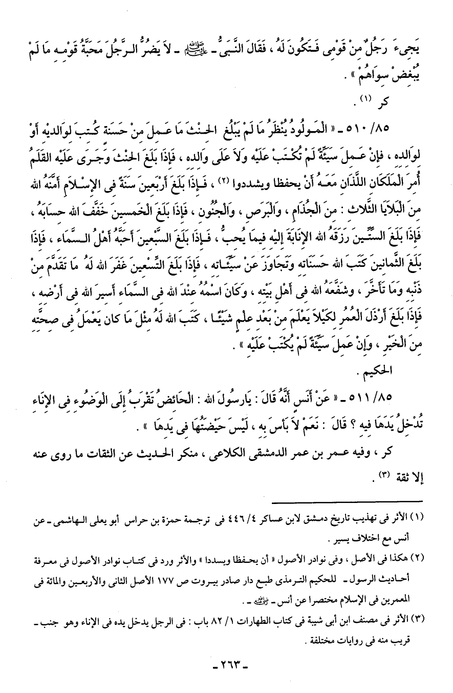 85/ 511 - "عَنْ أَنَسٍ أنَّهُ قَالَ: يَارسُولَ الله: الْحَائِضُ تَقْرَبُ إِلَى الْوَضُوءِ في الإِنَاءِ تُدْخِلُ يَدَهَا فِيهِ؟ قَالَ: نَعَمْ لاَ بَأسَ بِهِ، لَيْسَ حَيْضَتُهَا في يَدِهَا".