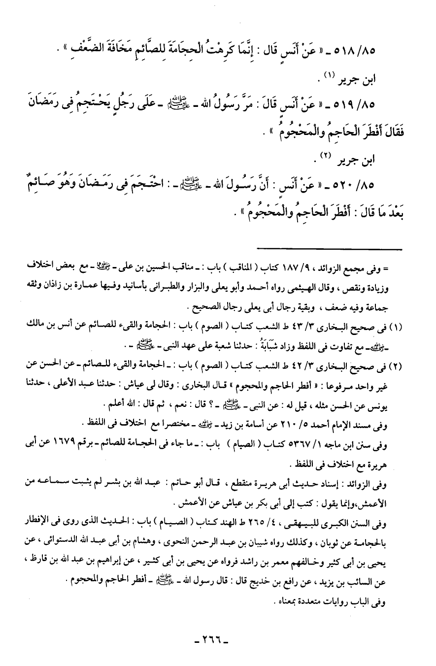 85/ 520 - "عَنْ أَنَسٍ: أَنَّ رَسُولَ الله - صلى الله عليه وسلم -: احْتَجَمَ في رَمَضَانَ وَهُوَ صَائِمٌ بَعْدَ مَا قَالَ: أَفْطَرَ الْحَاجِمُ والْمَحْجُومُ".