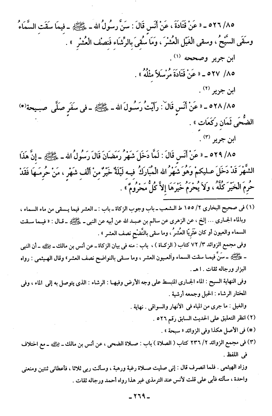 85/ 526 - "عَنْ قَتَادَةَ، عَنْ أَنَسٍ قَالَ: سَنَّ رسُولُ الله - صلى الله عليه وسلم - فِيمَا سَقَتِ السَّمَاءُ وسَقَى السَّيْحُ، وسقى الْغَيْل الْعُشْرَ، وَمَا سُقِىَ بِالرِّشَاءِ فَنِصْف الْعُشْرِ".