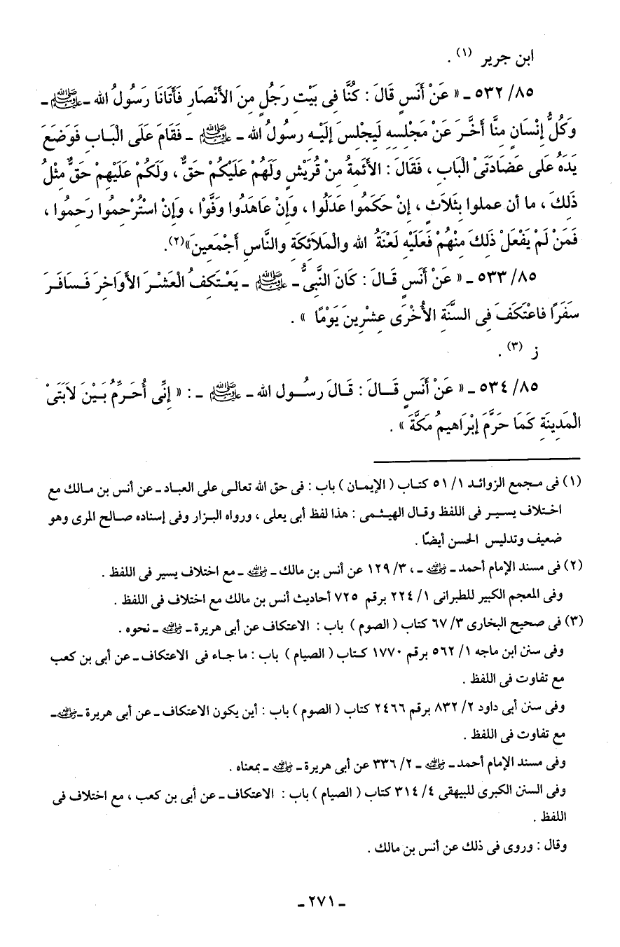 85/ 532 - "عَنْ أَنَسٍ قَالَ: كُنَّا في بَيْتِ رَجُل مِنَ الأنْصَارِ فَأَتَانَا رَسُولُ الله - صلى الله عليه وسلم - وَكُلُّ إِنْسَانٍ مِنَّا أَخَّرَ عَنْ مَجْلِسِهِ لَيِجْلِسَ إلَيْهِ رسُولُ الله - صلى الله عليه وسلم - فَقَامَ عَلَى الْبَابِ فَوضَعَ يَدَهُ عَلى عَضَادَتَىْ الْبَابِ، فَقَالَ: الأَئَمِةُ مِنْ قُرَيْشٍ وَلَهُمْ عَلَيْكُمْ حَقٌّ، وَلَكُمْ عَلَيْهِمْ حَقٌّ مِثْلُ ذَلِكَ، ما أن عملوا بِثَلاَثٍ، إِنْ حَكَمُوا عَدَلُوا، وِإنْ عَاهَدُوا وَفَّوْا، وِإنْ اسْتُرْحِمُوا رَحِمُوا، فَمَنْ لَمْ يَفْعَلْ ذَلِكَ مِنْهُمْ فًعَلَيْهِ لَعْنَةُ الله والْمَلاَئِكَةِ والنَّاسِ أَجْمَعِينَ" (¬2).