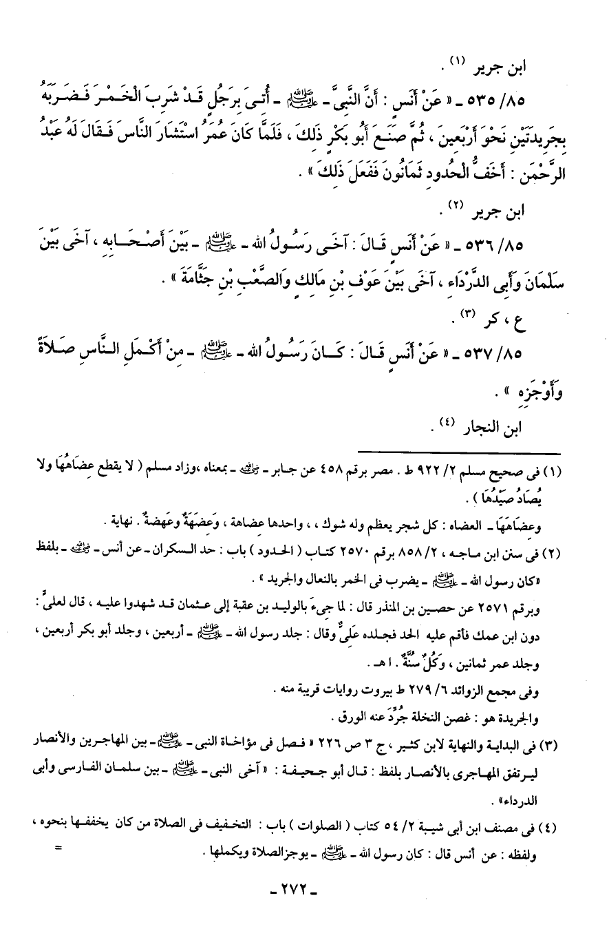 85/ 535 - "عَنْ أَنَسٍ: أنَّ النَّبِىَّ - صلى الله عليه وسلم - أُتىَ بِرَجُلٍ قَدْ شَرِبَ الْخَمْرَ فَضَرَبَهُ بِجَرِيدَتَيْنِ نَحْوَ أَرْبَعينَ، ثُمَّ صَنَعَ أَبُو بَكْرٍ ذَلِكَ، فَلَمَّا كَانَ عُمَرُ اسْتَشَارَ النَّاسَ فَقَالَ لَهُ عَبْدُ الرَّحْمَن: أَخَفُّ الْحُدودِ ثَمَانُونَ فَفَعَلَ ذَلِكَ".