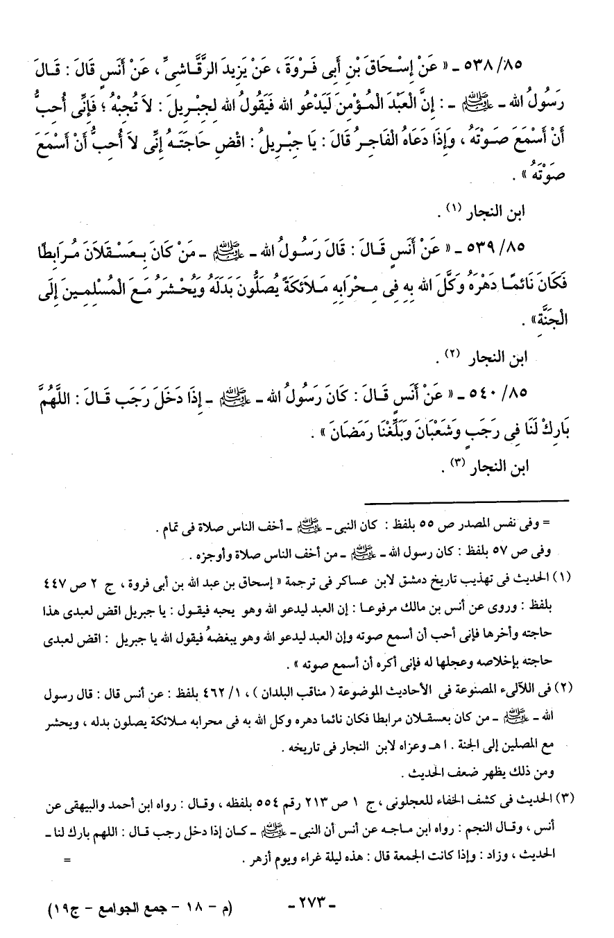 85/ 538 - "عَنْ إِسْحَاقَ بْنِ أَبِى فَرْوَةَ، عَنْ يَزِيدَ الرَّقَّاشِيِّ، عَنْ أَنَسٍ قَالَ: قَالَ رَسُولُ الله - صلى الله عليه وسلم -: إِن الْعَبْدَ الْمُؤْمِنَ لَيَدْعُو الله فَيَقُولُ الله لِجِبْرِيلَ: لاَ تُجبْهُ؛ فَإنِّى أُحِبُّ أَنْ أَسْمَعَ صَوْتَهُ، وَإذَا دَعَاهُ الْفَاجِرُ قَالَ: يَا جِبْرِيلُ: اقْضِ حَاجَتَهُ إِنِّى لاَ أُحِبُّ أَنْ أَسْمَعَ صَوْتَهُ".