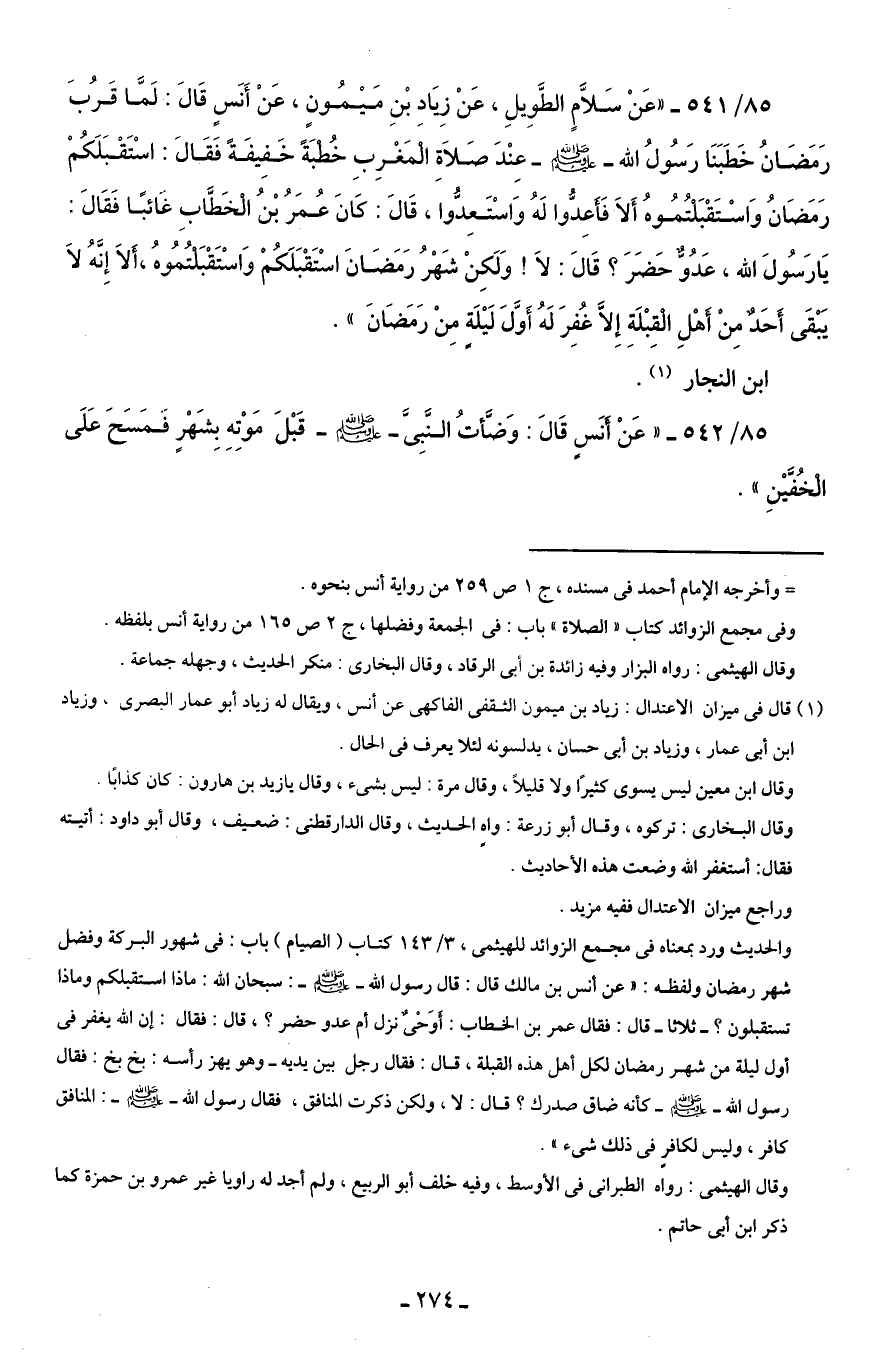 85/ 541 - "عَنْ سَلاَّمٍ الطَّوِيلِ، عَنْ زِيَادِ بْنِ مَيْمُونٍ، عَنْ أَنَسٍ قَالَ: لَمَّا قَرُبَ رَمَضَانُ خَطَبَنَا رَسُولُ الله - صلى الله عليه وسلم - عِنْدَ صَلاَةِ الْمَغْرِبِ خُطبَةً خَفِيفَةً فَقَالَ: اسْتَقْبَلَكُمْ رَمَضَانُ وَاسْتَقْبَلتُمُوهُ أَلاَ فَأَعِدُّوا لَهُ وَاسْتَعِدُّوا، قَالَ: كَانَ عُمَرُ بْنُ الْخَطَّابِ غائبًا فَقَالَ: يَا رَسُولَ الله، عَدُوٌّ حَضَرَ؟ قَالَ: لاَ! وَلَكِنْ شَهْرُ رَمَضَانَ اسْتَقْبَلَكُمْ وَاسْتَقْبَلتُمُوهُ، أَلاَ إِنَّهُ لاَ يَبْقَى أَحَدٌ مِنْ أَهْلِ الْقِبْلَةِ إِلَّا غُفِرَ لَهُ أَوَّلَ لَيْلَةٍ مِنْ رَمَضَانَ".