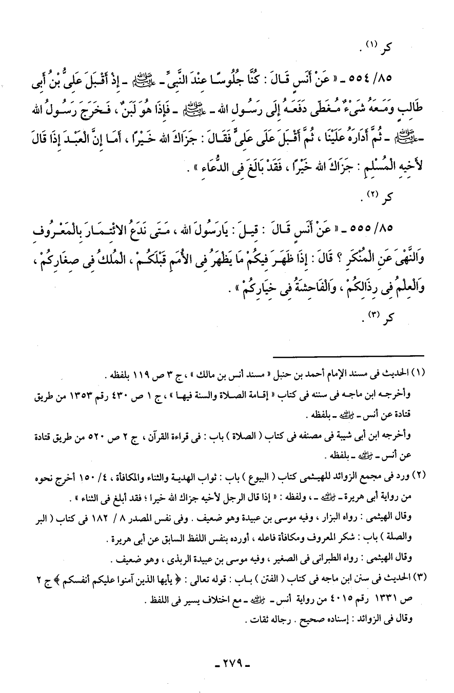 85/ 554 - "عَنْ أَنَسٍ قَالَ: كُنَّا جُلُوسًا عِنْدَ النَّبِيِّ - صلى الله عليه وسلم - إِذ أَقْبَلَ عَلِىُّ بْنُ أَبِى طَالِبٍ وَمَعَهُ شَىْءٌ مُغَطى دَفَعَهُ إِلَى رَسُول الله - صلى الله عليه وسلم - فَإِذَا هُوَ لَبَنٌ، فَخَرَجَ رَسُولُ الله - صلى الله عليه وسلم - ثُمَّ أدَارَهُ عَلَيْنَا، ثُمَّ أَقْبَلَ عَلَى عَلِىٍّ فَقَالَ: جَزَاكَ الله خَيْرًا، أَمَا إِنَّ الْعَبْدَ إِذَا قَالَ لأخيهِ الْمُسْلِمِ: جَزَاكَ الله خَيْرًا، فَقَدْ بَالَغَ في الدُّعَاءِ".