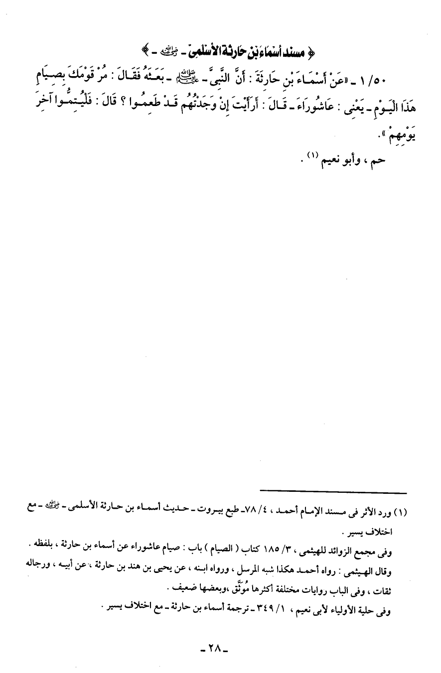 50/ 1 - " عَنْ أسْمَاءَ بْنِ حَارِثَةَ: أنَّ النبِيَّ - صلى الله عليه وسلم - بَعَثَهُ فَقَالَ: مُرْ قَوْمَكَ بِصِيَام هَذَا اليَوْمِ - يَعْنِى: عَاشُورَاءَ - قَالَ: أَرَأَيْتَ إِنْ وَجَدْتُهُم قَدْ طَعِمُوا؟ قَالَ: فَليُتِمُّوا آخِرَ يَوْمِهِمْ".