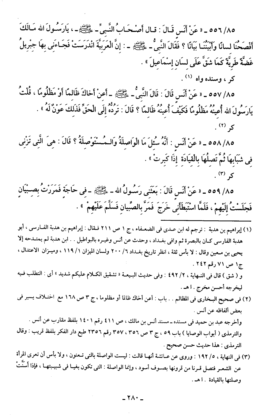85/ 557 - "عَنْ أَنَسٍ قَالَ: قَالَ النَّبِىُّ - صلى الله عليه وسلم - أَعِنْ أَخاكَ ظَالِمًا أَوْ مَظلُومًا، قُلتُ يَا رَسُولَ الله أُعِينُهُ مَظلُومًا فَكَيْفَ أُعِينُهُ ظَالِمًا؟ قَالَ: تَرُدُّهُ إِلَى الْحَقِّ فَذَلِكَ عَوْنٌ لَهُ".