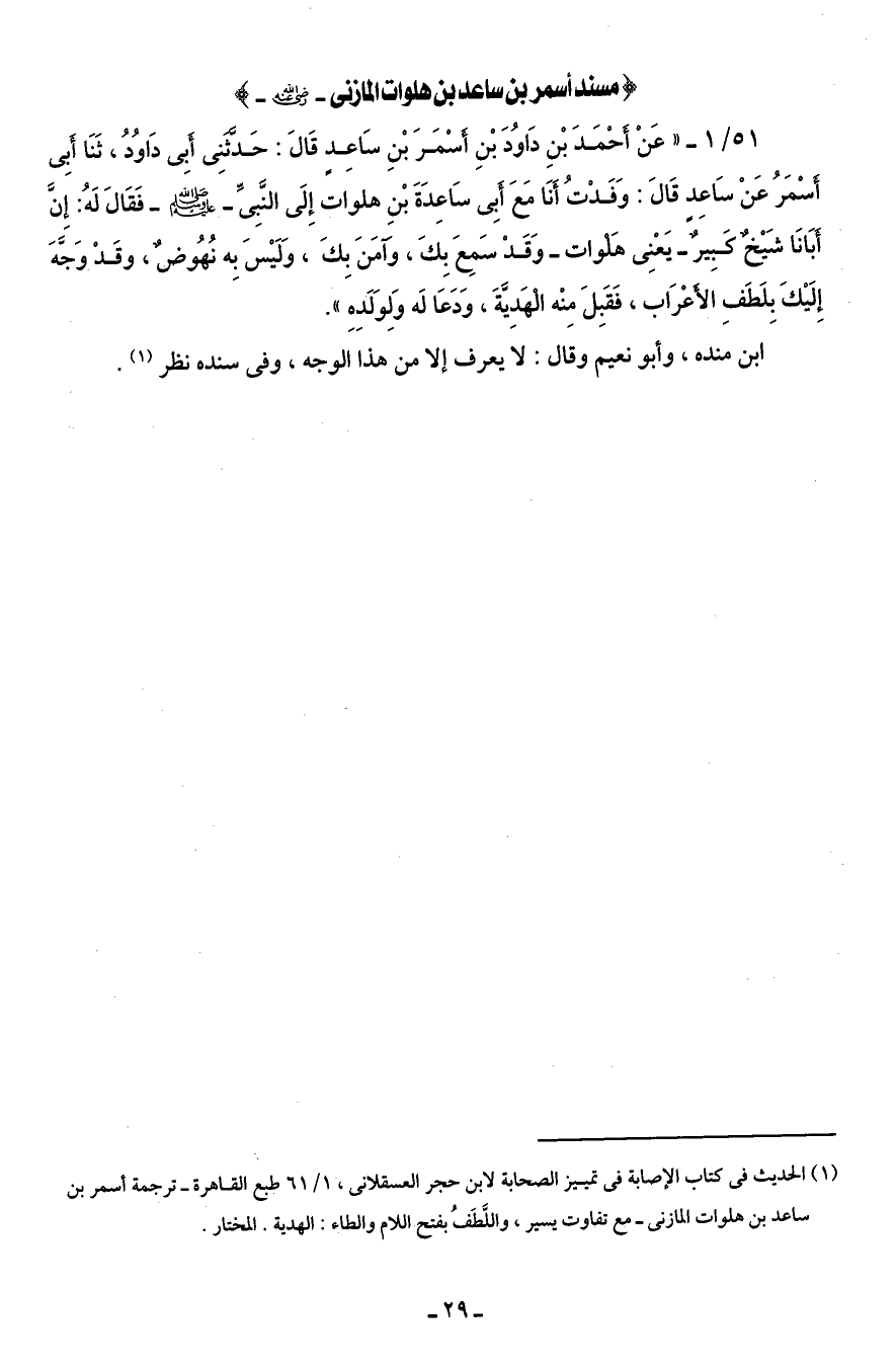 51/ 1 - " عَنْ أحمَدَ بْنِ دَاوُدَ بْنِ أسْمَرَ بْنِ سَاعِد قَالَ: حَدثنِى أبى دَاوُدُ، ثَنَا أبى أسْمَرُ عَنْ سَاعِدٍ قَالَ: وَفَدْتُ أَنَا مَعَ أبى سَاعِدَةَ بْنِ هلوات إِلَى النَّبِىِّ - صلى الله عليه وسلم - فَقَالَ لَهُ: إِنَّ أبَانَا شَيْخٌ كبِيرٌ - يَعْنِى هَلْوات - وَقَدْ سَمِعَ بِكَ، وآمَنَ بِكَ، وَلَيْسَ بِه نُهُوضٌ، وقَدْ وَجَّهَ إِلَيْكَ بِلَطَفِ الأَعْرَاب، فَقَبِلَ مِنْه الهَدِيَّةَ، وَدَعَا لَه وَلِوَلَدِهِ".