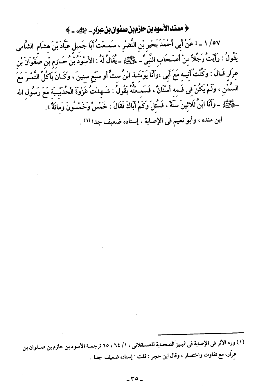 57/ 1 - " عَنْ أبى أحمَدَ بَحْيرِ بْنِ النَّضْرِ، سَمِعْتُ ابَا جَمِيلٍ عَبادَ بْنَ هِشَامٍ الشَّامى يَقُولُ: رَأيْتُ رَجُلاً مِنْ أصْحَابِ النَّبِى - صلى الله عليه وسلم - يُقَالُ لَهُ: الأسْوَدُ بْنُ حَازِم بْنِ صفْوَانَ بْنِ عِرَارٍ قَالَ: وَكنتُ آتِيهِ مَعَ أبِى، وَأنَا يَؤمَئِذٍ ابْنُ سِتٍّ أو سَبعْ سِنِينَ، وَكانَ يَأكُلُ التَّمْرَ مَعَ السَّمْنِ، وَلَمْ يَكُنْ فِى فَمِهِ أسْنَانٌ، فَسَمِعْتُهُ يَقُولُ: شَهِدْتُ غَزْوَةَ الحُدَيْبِيَة مَعَ رَسُولِ الله - صلى الله عليه وسلم - وَأنَا ابْنُ ثَلاِثينَ سَنَةً، فَسُئِلَ وَكَمْ أبَاكَ فَقَالَ: خَمس وخَمْسُونَ وَمِائَة".