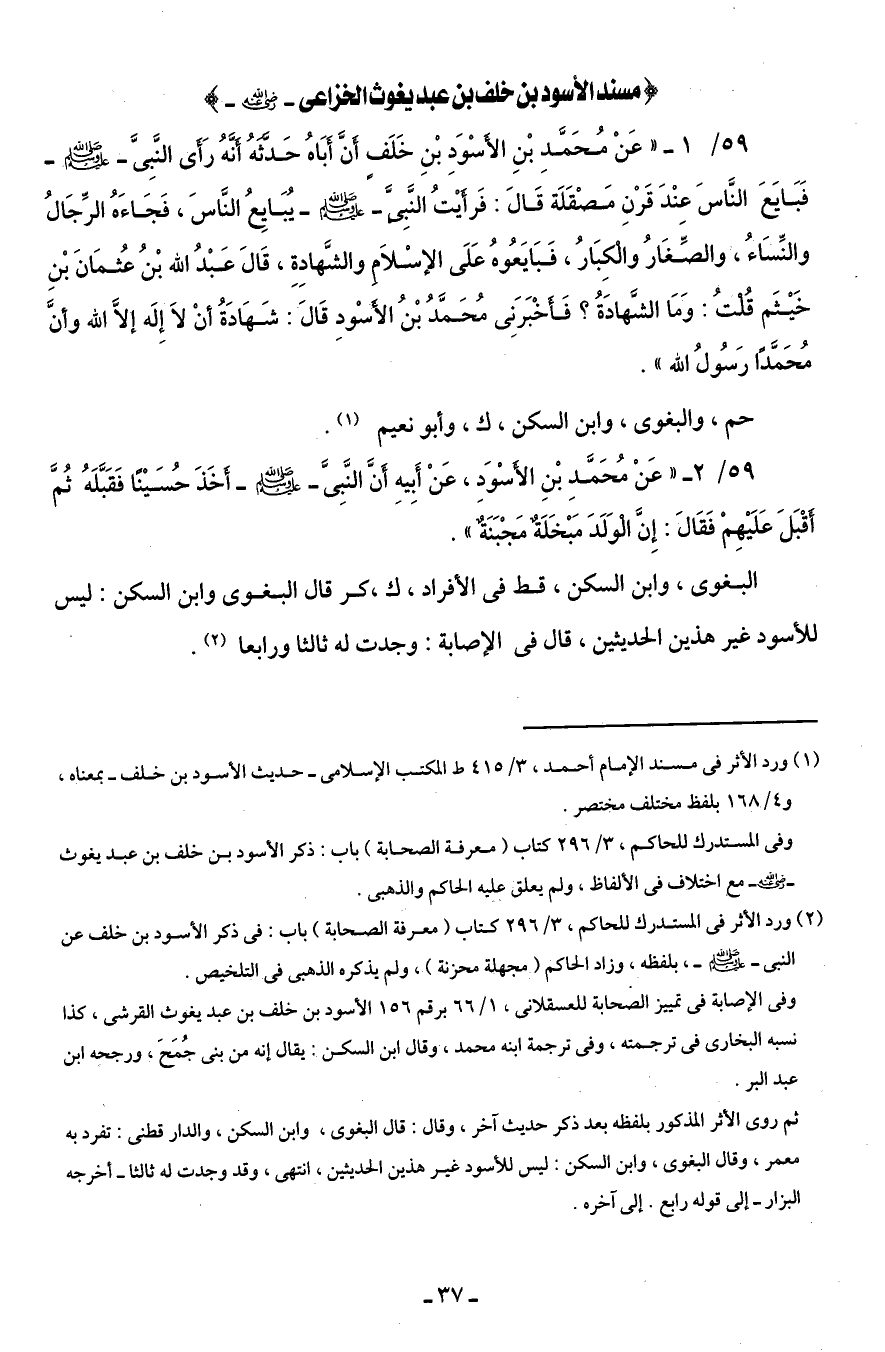 البغوى، وابن السكن، قط في الأفراد، ك، كر قال البغوى وابن السكن: ليس للأسود غير هذين الحديثين، قال في الإصابة: وجدت له ثالثا ورابعا (¬2).