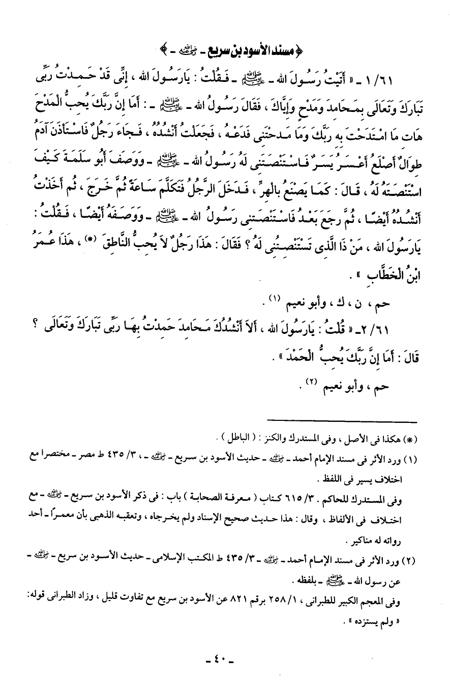 61/ 1 - " أتَيْتُ رَسُولَ الله - صلى الله عليه وسلم - فَقُلتُ: يَا رَسُولَ الله، إِنِّى قَدْ حَمِدْتُ ربِّى تَبَارَكَ وَتَعَالَى بِمَحَامِدَ وَمَدحٍ وَإِيَّاكَ، فَقَالَ رَسُولُ الله - صلى الله عليه وسلم -: أمَا إِنَّ رَبَّكَ يُحِبُّ المَدْحَ هَاتِ مَا امْتَدَحْتَ بِهِ رَبَّكَ وَمَا مَدحْتَنِى فَدَعْهُ، فَجَعَلتُ أنْشُدُهُ، فَجَاءَ رَجُلٌ فَاسْتَأذَنَ آدَمُ طِوَالٌ أَصْلَعُ أَعْسَرُ يَسَرٌ فَاسْتَنْصَتَنِى لَهُ رَسُولُ الله - صلى الله عليه وسلم - وَوَصَفَ أبُو سَلَمَةَ كيْفَ اسْتَنْصَتَهُ لَهُ، قَالَ: كَمَا يَصْنَعُ بالهِرِّ، فَدَخَلَ الرَّجُلُ فَتَكَلَّمَ سَاعَةً ثُمَّ خَرج، ثُم أخَذْتُ أنشُدُهُ أيْضا، ثُمَّ رجَعَ بَعْدُ فَاسْتَنْصَتنِى رَسُولُ الله - صلى الله عليه وسلم - وَوَصَفَهُ أيضًا، فَقُلتُ: يَا رَسُولَ الله، مَنْ ذَا الذِى تَسْتَنْصِتُنِى لَهُ؟ فَقَالَ: هَذَا رَجُلٌ لاَ يُحِبُّ النَّاطِقَ (*)، هَذَا عُمَرُ ابْنُ الخَطَّابِ".