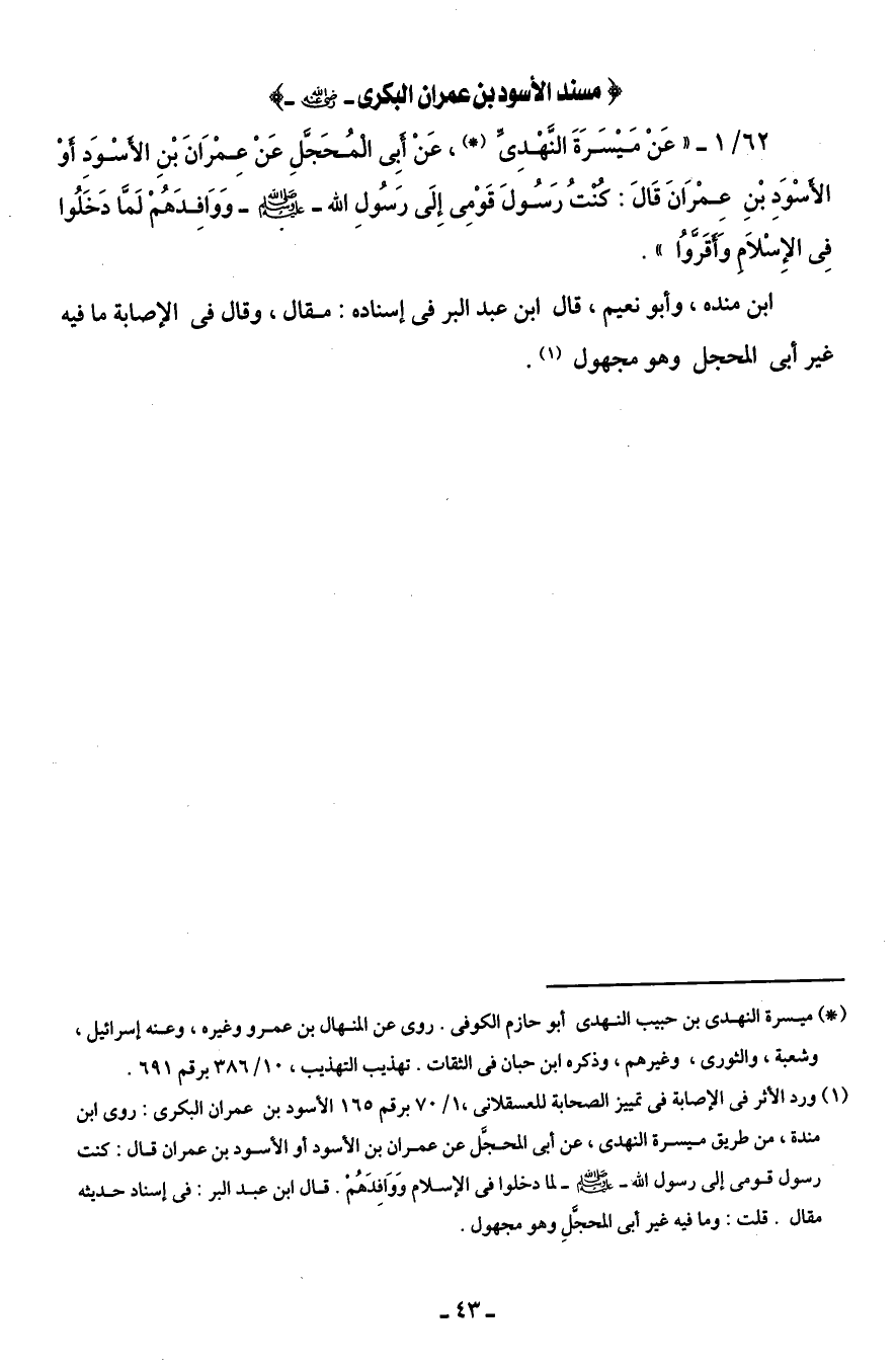 62/ 1 - " عَنْ مَيْسَرَةَ النَّهْدِى (*)، عَنْ أبِى المُحَجَّلِ عَنْ عِمْرَانَ بْنِ الأسْوَدِ أوْ الأسْوَدِ بْنِ عِمْرَانَ قَالَ: كنتُ رَسُولَ قَوْمِى إِلَى رَسُولِ الله - صلى الله عليه وسلم - وَوَافدَهُمْ لَمَّا دَخَلُوا فِى الإِسْلاَم وَأقَرَّوا".
