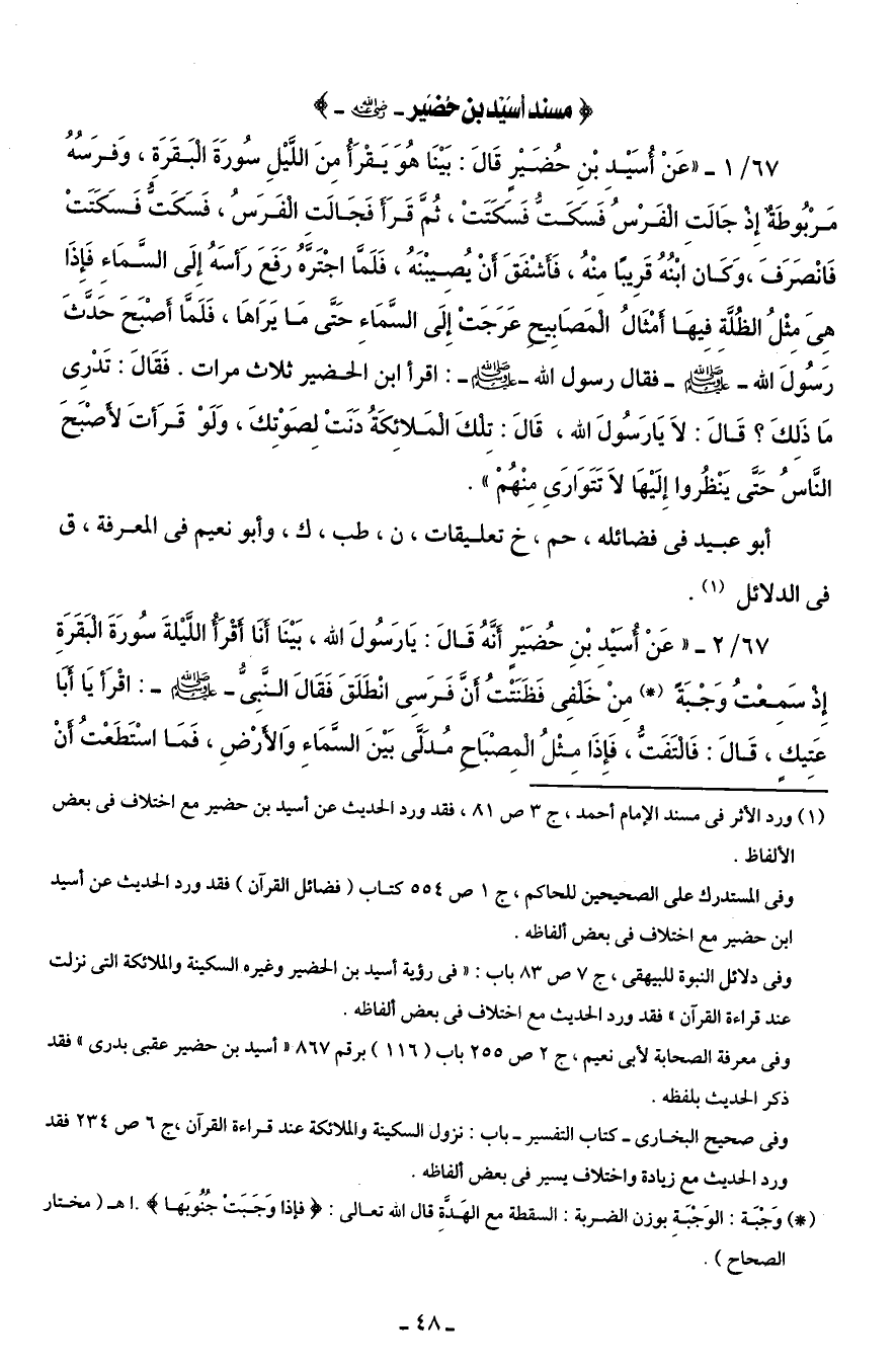 67/ 2 - " عَنْ أُسَيْد بْنِ حُضَيْرٍ أَنَّهُ قَالَ: يَارَسُولَ الله، بَيْنَا أَنَا أَقْرَأ اللَّيْلةَ سُورَةَ الْبَقَرَةِ إِذ سَمِعْتُ وَجْبَةً (*) مِنْ خَلْفِى فَظَنَتْتُ أَنَّ فَرَسِى انْطَلَقَ فَقَالَ النَّبِىُّ - صلى الله عليه وسلم -: اقْرَأ يَا أَبَا عَتِيكٍ، قَالَ: فَالْتَفَتُّ، فَإِذَا مِثْلُ الْمِصْبَاح مُدَلَّى بَيْنَ السَّمَاءِ وَالأَرْضِ، فَمَا اسْتَطَعْتُ أَنْ