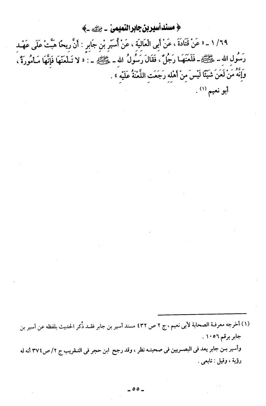 69/ 1 - " عَنْ قَتَادَةَ، عَنْ أَبِى الْعَالِيَةِ، عَنْ أُسَيْرِ بْنِ جَابِرٍ: أَنَّ رِيحًا هَبَّتْ عَلَى عَهْدِ رَسُولِ اللهِ - صلى الله عليه وسلم - فَلَعَنَهَا رَجُلٌ، فَقَالَ رَسُولُ اللهِ - صلى الله عليه وسلم -: " لا تَلعَنْهَا فَإِنَّهَا مَأمُورَةٌ، وَإنَّهُ مَنْ لَعَنَ شَيْئًا لَيْسَ مِنْ أَهْلِهِ رَجَعَتِ اللَّعْنَةُ عَلَيْهِ ".