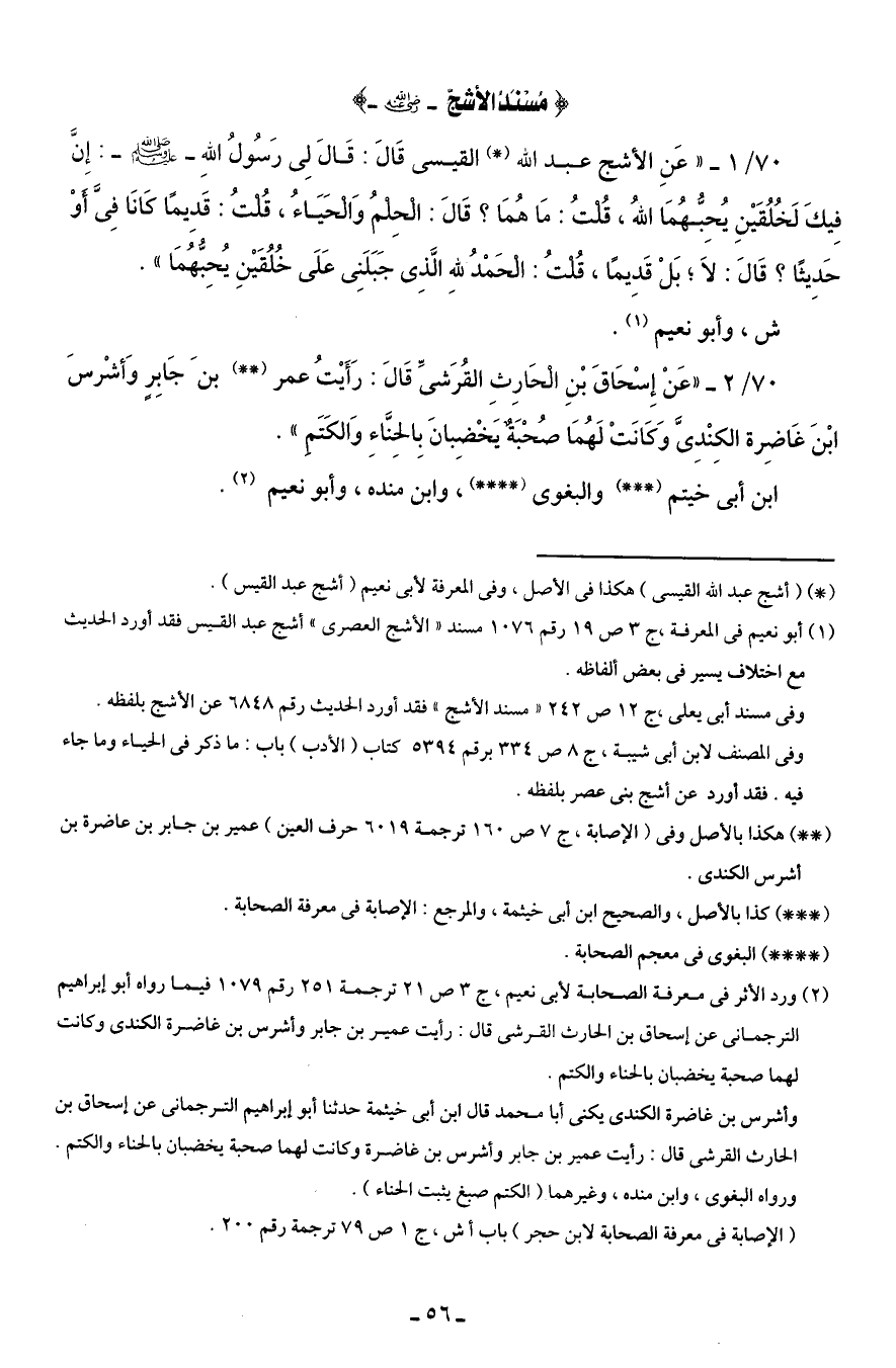 70/ 1 - " عَنِ الأشج عبد الله (*) القيسى قَالَ قَالَ لِى رَسُولُ اللهِ - صلى الله عليه وسلم - إِنَّ فِيكَ لَخُلُقَيْنِ يُحِبُّهُمَا الله، قُلْتُ: مَا هُمَا؟ قَالَ: الْحِلْمُ وَالْحَيَاءُ، قُلْتُ: قَدِيمًا كَانَا فِىَّ أَوْ حَدِيثًا؟ قَالَ: لاَ؛ بَلْ قَدِيمًا، قُلْتُ: الْحَمْدُ للهِ الَّذِى جَبَلَنِى عَلَى خُلُقَيْنِ يُحِبُّهُمَا ".