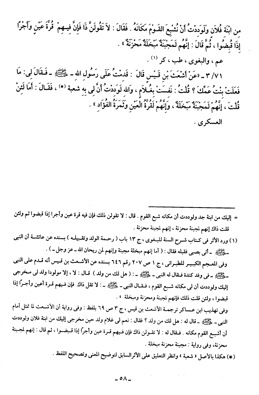71/ 3 - "عَنْ أَشْعَثَ بْنِ قَيْسٍ قَالَ: قَدِمْتُ عَلَى رَسُولِ اللهِ - صلى الله عليه وسلم - فَقَالَ لِى: مَا فَعَلَتْ بنْتُ عَمِّكَ؟ قُلْتُ: نَفِسَتْ بِغُلاَمٍ، وَاللهِ لَوَدِدْتُ أَنَّ لِى بِهِ شعبة (*)، فَقَالَ: أَمَا لَئِنْ قُلتَ، إنَّهُمْ لَمَجْبَنَةٌ مَبْخَلَةٌ، وَإِنَّهُمْ لَقُرَّةُ الْعَيْنِ وَثَمَرَةُ الفُؤَادِ ".