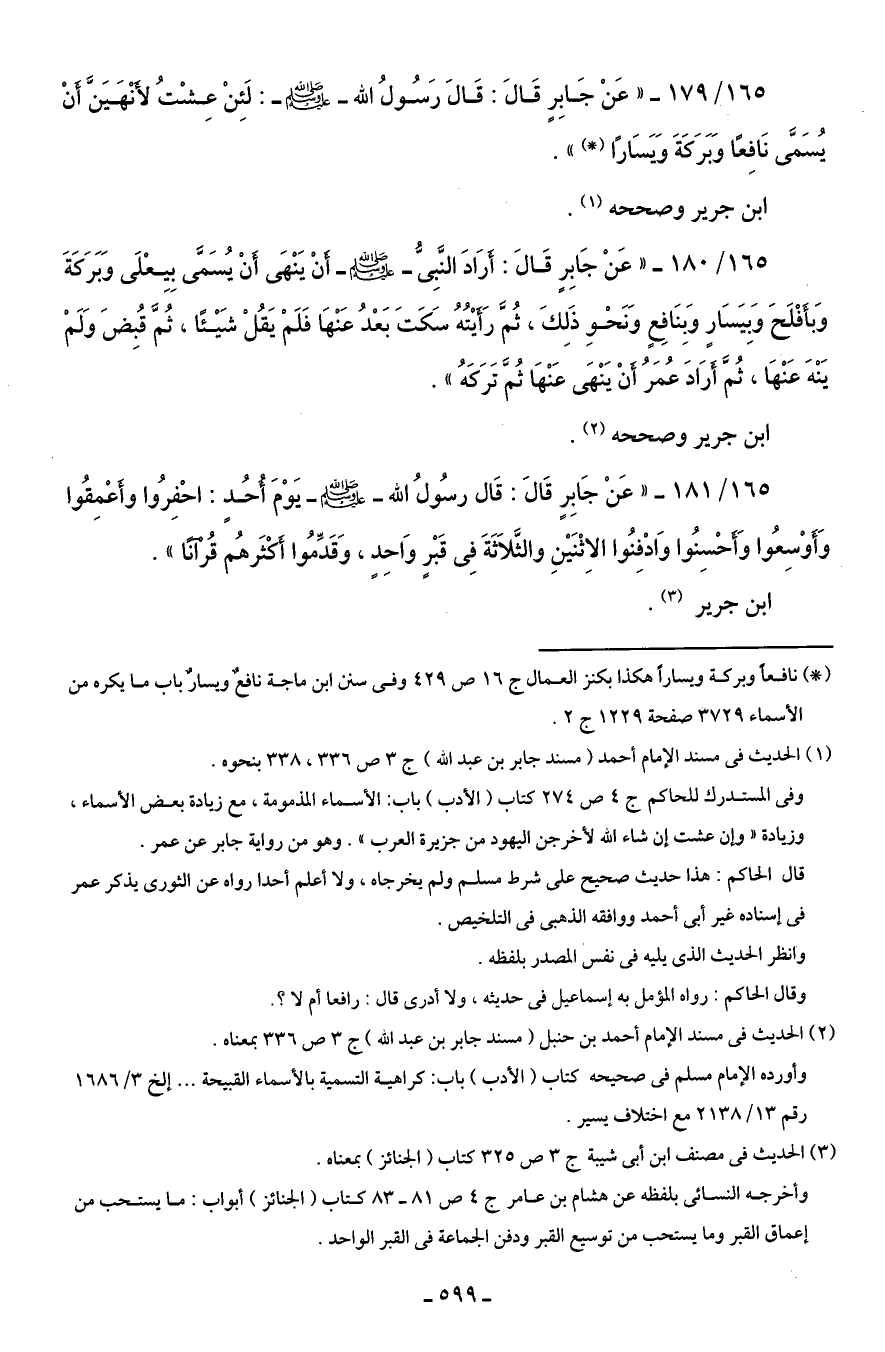 165/ 179 - "عَنْ جَابِرٍ قَالَ: قَالَ رَسُولُ الله - صلى الله عليه وسلم -: لَئِنْ عِشْتُ لأَنهَيَنَّ أَنْ يُسَمَّى نَافِعًا وَبَرَكَةَ وَيَسَارًا (*) ".