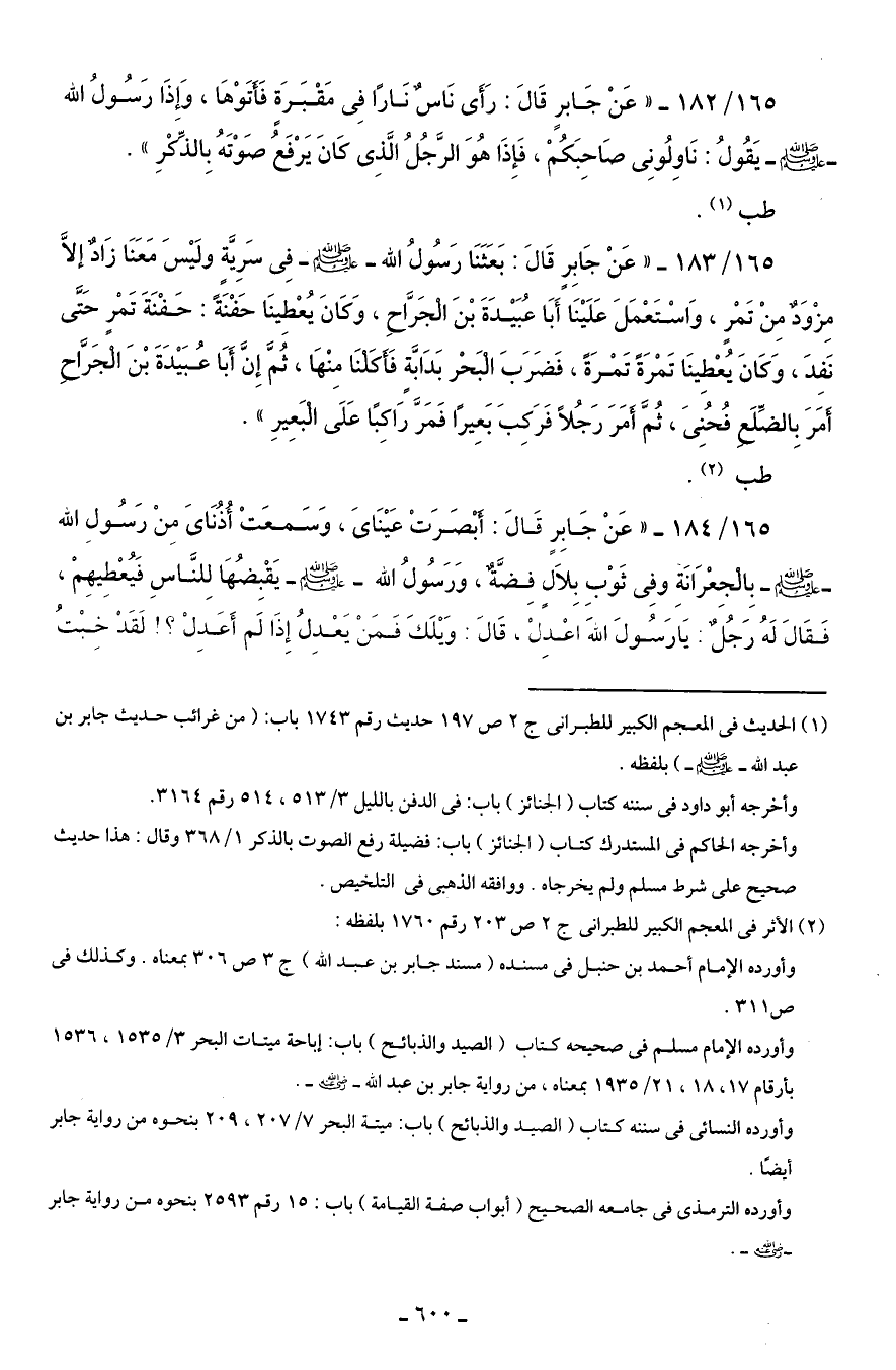 165/ 184 - "عَنْ جَابِرٍ قَالَ: أَبْصَرَتْ عَيْنَاىَ، وَسَمعَتْ أُذُنَاىَ مِنْ رَسُولِ الله - صلى الله عليه وسلم - بِالْجِعْرَانَةِ وفِى ثَوْبِ بِلاَلٍ فِضَّةٌ، وَرَسُولُ الله - صلى الله عليه وسلم - يَقْبِضُهَا لِلنَّاسِ فَيُعْطِيهِمْ، فَقَالَ لَهُ رَجُلٌ يَارَسُولَ اللهَ اعْدِلْ، قَالَ: وَيْلَكَ فَمَنْ يَعْدِلُ إِذَا لَم أَعَدِلْ؟ ! لَقَدْ خِبْتُ