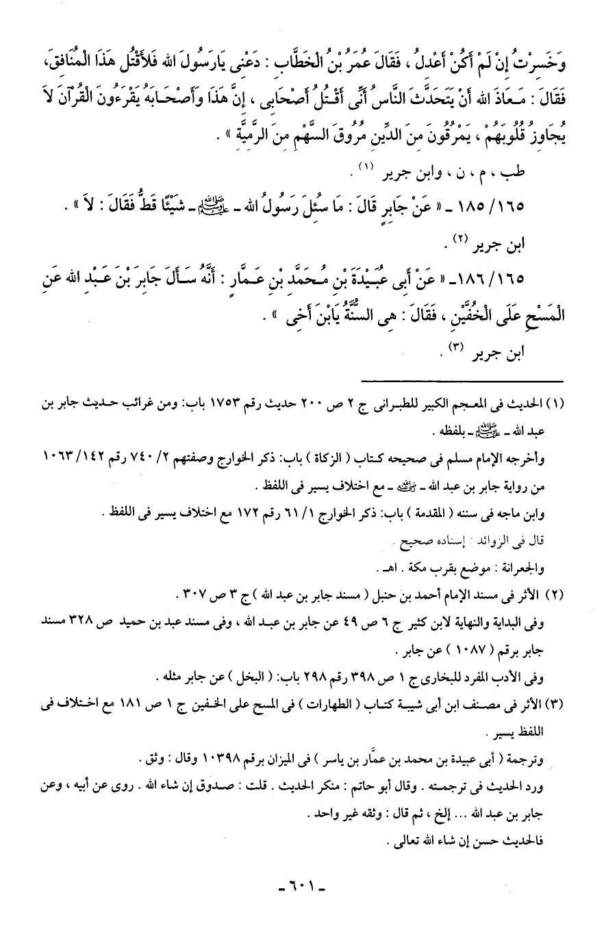 165/ 186 - "عَنْ أَبِى عُبَيْدَةَ بْنِ مُحَمَّدِ بْنِ عَمَّارٍ: أَنَّهُ سَأَلَ جَابِرَ بْنَ عَبْدِ الله عَنِ الْمَسْح عَلَى الْخُفَّيْنِ، فَقَالَ: هِى السُّنَّةُ يَابْنَ أَخِى".