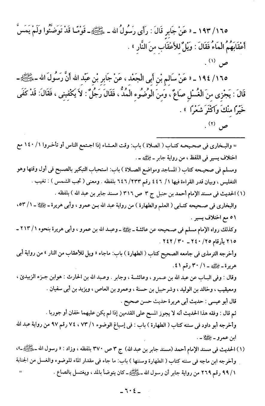 165/ 193 - "عَنْ جَابِرٍ قَالَ: رَأَى رَسُولُ الله - صلى الله عليه وسلم - قَوْمًا قَدْ تَوَضَّئُوا وَلَمْ يَمَسَّ أَعْقَابَهُمُ الْمَاءُ فَقَالَ: وَيْلٌ لِلأَعْقَابِ مِنَ النَّارِ".