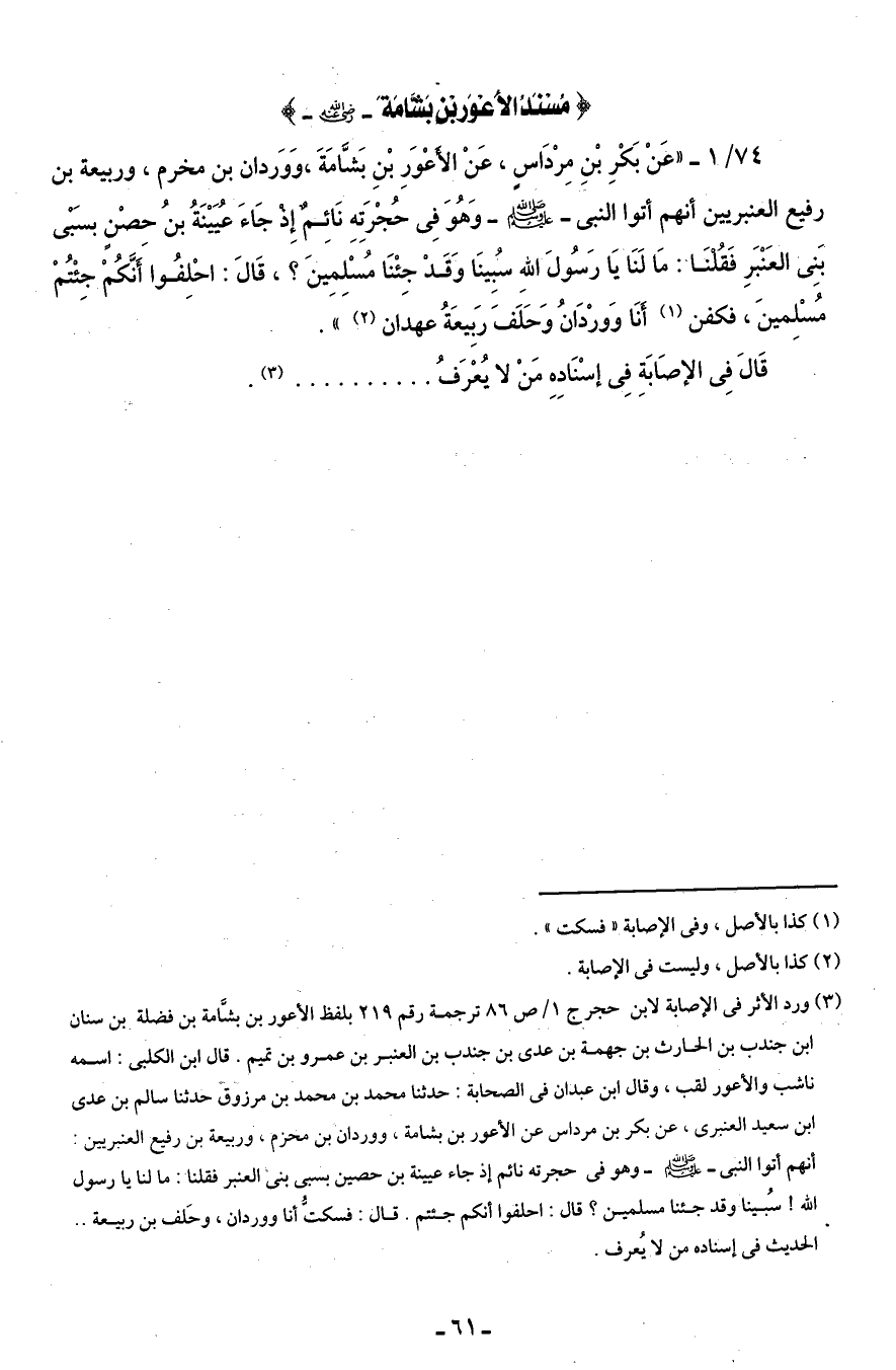 74/ 1 - " عَنْ بَكْرِ بْن مِرْدَاسٍ، عَنْ الأَعْوَرِ بْنِ بَشَّامَةَ، وَوَردان بن مخرم، وربيعة بن رفيع العنبريين أنهم أتوا النبي - صلى الله عليه وسلم - وَهُوَ فِى حُجْرَتِهِ نَائِمٌ إِذ جَاءَ عُيَيْنَةُ بنُ حصْنٍ بسَبْى بَنِى العَنْبَرِ فَقُلْنَا: مَا لَنَا يَا رَسُولَ اللهِ سُبِينَا وَفَدْ جِئْنَا مُسْلِمِينَ؟ ، قَالَ: احْلِفُوا أَنَّكُمْ جِئْتُمْ مُسْلِمينَ، فكفن (¬1) أَنَا وَورْدَانُ وَحَلَفَ رَبِيعَةُ عهدان (¬2) ".