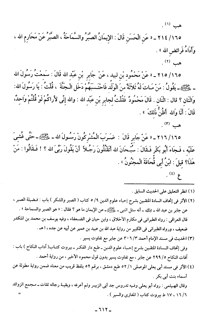 165/ 215 - "عَنْ مَحْمُودِ بْنِ لبيدٍ، عَنْ جَابِرِ بْنِ عَبْد الله قَالَ: سَمعْتُ رَسُولَ الله - صلى الله عليه وسلم - يَقُولُ: مَنْ مَاتَ لَهُ ثَلاَثَةٌ مِنَ الْوَلَدِ فَاحْتَسَبَهُمْ دَخَل الْجَنَّةَ، قُلْتُ: يَا رَسُولَ الله: وَاثْنَانِ؟ قال: اثْنَانِ. قَالَ مَحْمُودٌ فَقُلْتُ لِجابِرِ بْنِ عَبْدِ الله: والله إِنِّى لأَراكُمْ لَوْ قُلْتُمْ وَاحِدٌ، قَالَ: أَنَا وَالله أَظُنُّ ذَلِكَ".