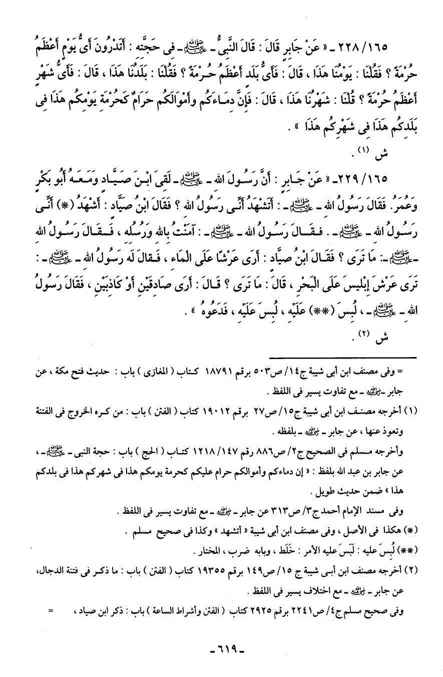 165/ 229 - " عَنْ جَابِرٍ: أَنَّ رَسُولَ اللهِ - صلى الله عليه وسلم - لَقِىَ ابْنَ صَيَّاد وَمَعَهُ أبُو بَكْرٍ وَعُمَرُ. فَقَالَ رَسُولُ اللهِ - صلى الله عليه وسلم -: أَتَشْهَدُ أَنِّى رَسُولُ اللهِ؟ فَقَالَ ابْنُ صَيَّادٍ: أَشْهَدُ (*) أَنِّى رَسُولُ اللهِ - صلى الله عليه وسلم -. فقَالَ رَسُولُ الله - صلى الله عليه وسلم -: آمَنْتُ باللهِ وَرسُلِهِ، فَقَالَ رَسُولُ اللهِ - صلى الله عليه وسلم -: مَا تَرَى؟ فَقَالَ ابْنُ صيَّادٍ: أَرَى عَرْشًا عَلَى الْمَاءِ، فَقالَ لَى رَسُولُ اللهِ - صلى الله عليه وسلم -: تَرَى عَرْشَ إِبْليسَ عَلَى الْبَحْرِ، قَالَ: مَا تَرَى؟ قَالَ: أَرَى صَادِقَيْنِ أَوْ كَاذِبَيْنِ، فَقَالَ رَسُولُ الله - صلى الله عليه وسلم -، لُبِسَ (* *) عَلَيْهِ، لُبِسَ عَلَيْهِ، فَدَعُوهُ ".