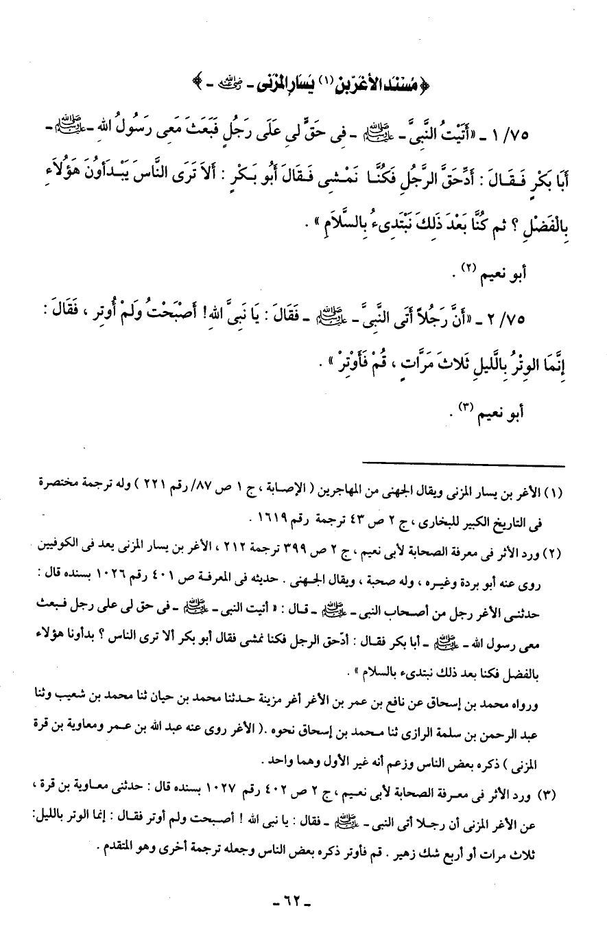(¬3) ورد الأثر في معرفة الصحابة لأبى نعيم، ج 2 ص 402 رقم 1027 بسنده قال: حدثنى معاوية بن قرة، عن الأغر المزنى أن رجلًا أتى النبي - صلى الله عليه وسلم - فقال: يا نبى الله! أصبحت ولم أوتر فقال: إنما الوتر بالليل: ثلاث مرات أو أربع شك زهير. قم فأوتر ذكره بعض الناس وجعله ترجمة أخرى وهو المتقدم.