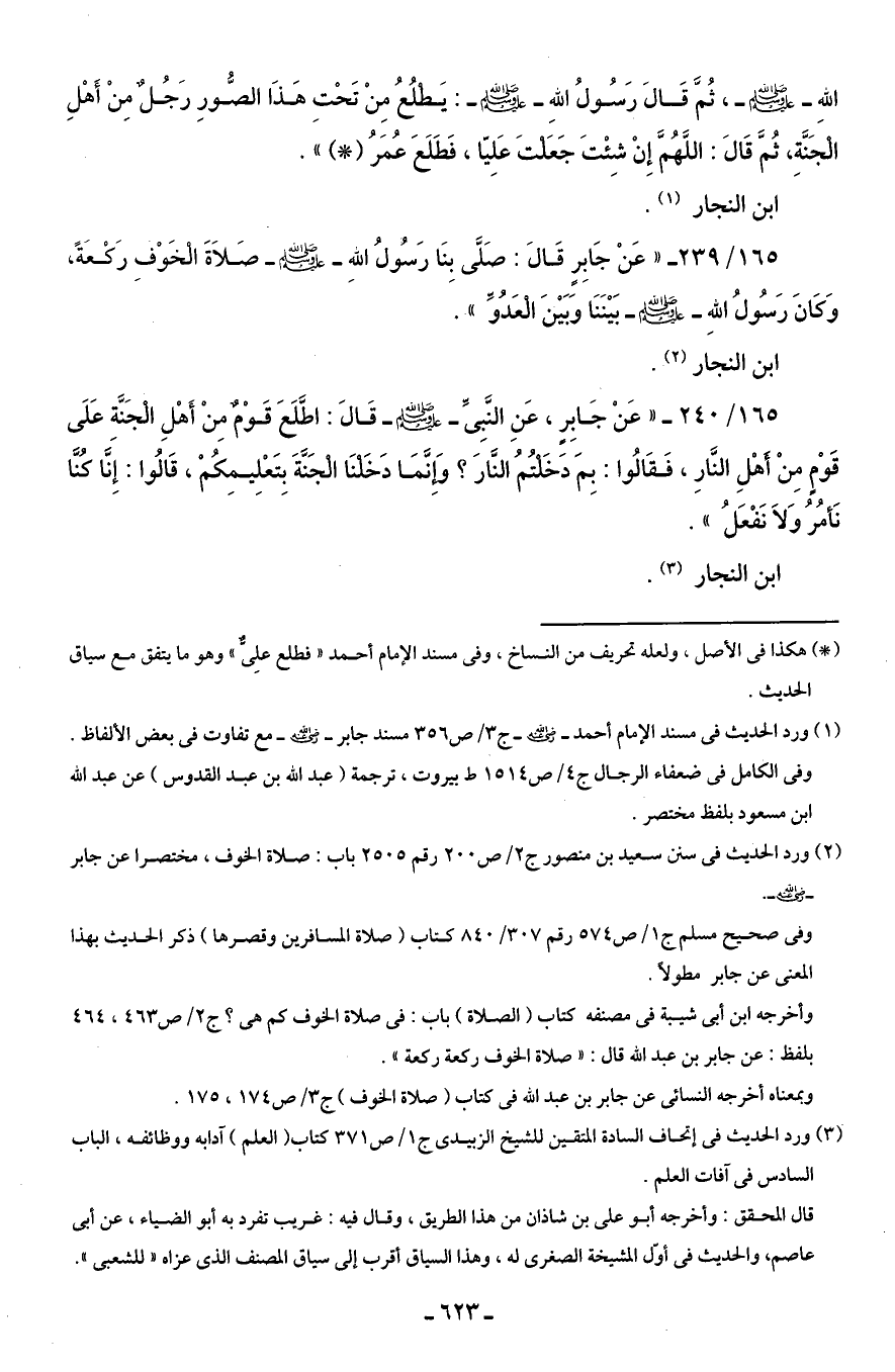 165/ 239 - " عَنْ جَابِرٍ قَالَ: صَلَّى بِنَا رَسُولُ اللهِ - صلى الله عليه وسلم - صَلاَةَ الْخَوْفِ رَكْعَةً، وَكَانَ رَسُولُ اللهِ - صلى الله عليه وسلم - بَيْنَنَا وَبَيْنَ الْعَدُوِّ".