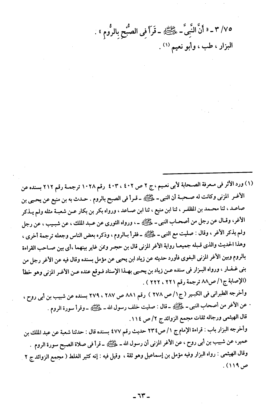 75/ 3 - " أَنَّ النَّبِىَّ - صلى الله عليه وسلم - قَرَأَ فِى الصُّبْح بِالرُّومِ ".
