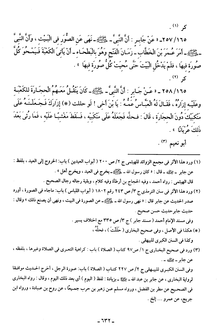 165/ 258 - " عَنْ جَابِرٍ: أَنَّ النَّبِىَّ - صلى الله عليه وسلم - كَانَ يَنْقُلُ مَعَهُمُ الْحجَارَةَ لِلكَعْبَةِ وعَلَيْهِ إِزَارُهُ، فَقَالَ لَهُ الْعَبَّاسُ عَمُّهُ: يَا بْنَ أَخِى! لَو حللت (*) إِزَارَكَ فَجَعَلْتَهُ عَلَى مَنْكِبَيْكَ دُونَ الْحِجَارَةِ، قَالَ: فحلَّه فَجَعَلَهُ عَلَى مَنْكَبِيْهِ، فَسَقَطَ مَغْشِيًا عَلَيْهِ، فَمَا رُئىَ بَعْدَ ذَلِكَ عُرْيَانًا ".