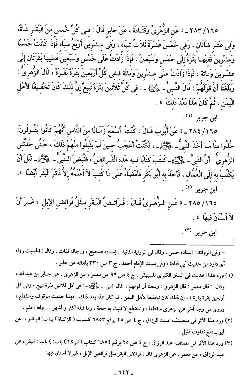 165/ 283 - " عَنِ الزُّهْرِىِّ وَقَتَادَةَ، عَنْ جَابِرٍ قَالَ: فِى كُلِّ خْمِسٍ مِنَ الْبَقَرِ شَاةٌ، وَفِى عَشْرٍ شَاتَانِ، وَفِى خَمْسَ عَشْرَةَ ثَلاَثُ شِيَاهٍ، وَفِى عِشْرِينَ أَرْبَعُ شِيَاهٍ فَإذَا كَانَتْ خَمْسًا وَعِشْرِينَ فَفِيَها بَقَرَةُ إِلَى خَمْسٍ وَسَبْعينَ، فَإِذَا زَادَتْ عَلَى خَمْسٍ وَسَبْعِين فَفِيهَا بَقَرَتَانِ إِلَى عِشْرِينَ وَمِائةٍ، فَإِذَا زَادَتْ علَى عشْرِينَ وَمِائَةٍ فِفِى كُلِّ أَرْبَعِينَ بَقَرَةً بَقَرَةٌ، قَالَ الزُّهرِىُّ: وَبَلَغَنَا أَنَّ قَوْلَهُمْ: قَالَ النَّبِىُّ - صلى الله عليه وسلم -: فِى كُلَّ ثَلاَثِينَ بَقَرَةً تَبِيعٌ إِنَّ ذِلَكَ كَانَ تَخْفِيفًا لأَهْلِ الْيَمَنِ، ثُمَّ كَانَ هَذَا بَعْدَ ذَلِكَ ".
