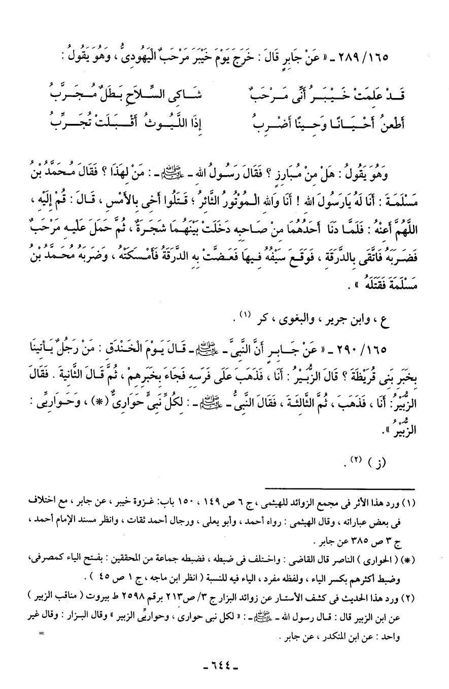 165/ 289 - " عَنْ جَابِرٍ قَالَ: خَرَجَ يَوْمَ خَيْبَرَ مَرْحَبٌ الْيَهُودِىُّ، وَهُوَ يَقُولُ: