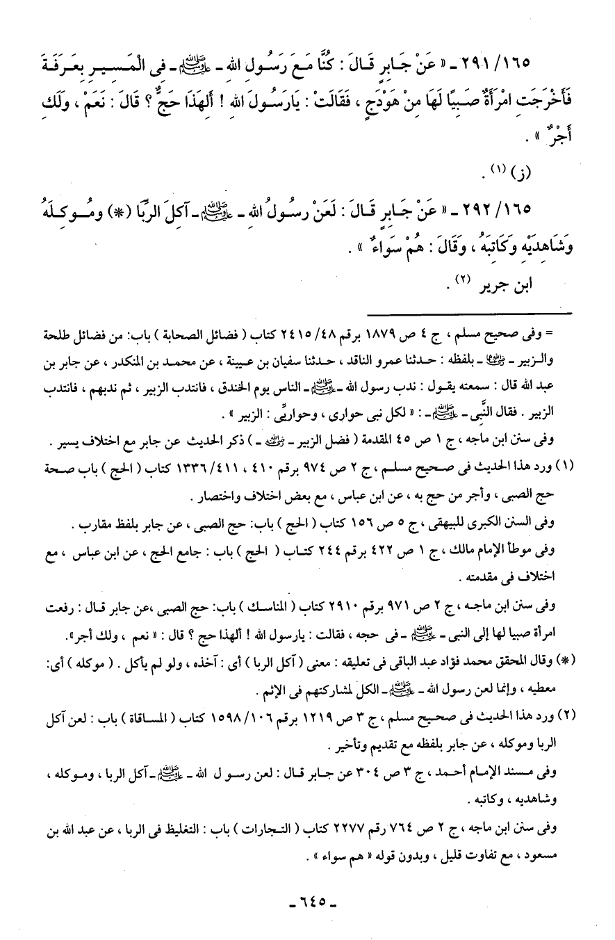 165/ 292 - "عَنْ جَابِرٍ قَالَ: لَعَنْ رسُولُ اللهِ - صلى الله عليه وسلم - آكِلَ الربا (*) ومُوكِلَهُ وَشَاهِدَيْهِ وَكاتِبَهُ، وَقَالَ: هُمْ سَواءٌ".