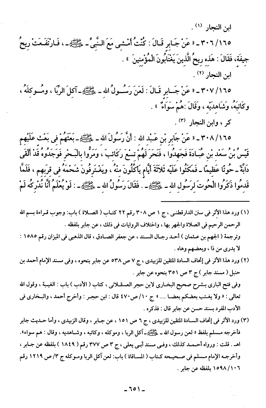 (¬3) ورد الأثر في إتحاف السادة المتقين للزبيدى، ج 6 ص 151، عن جابر، وقال الزبيدى، وأما حديث جابر فأخرجه مسلم بلفظ "لعن رسول الله - صلى الله عليه وسلم - آكل الربا، وموكله، وكاتبه، وشاهديه، وقال: هم سواء".اه. قلت: ورواه أحمد كذلك، وفى مسند أبى يعلى، ج 3 ص 377 رقم (1849) بلفظه عن جابر، وأخرجه الإمام مسلم في صحيحه كتاب (المساقاة) باب: لعن آكل الربا وموكله ج 3/ ص 1219 رقم 106/ 1598 بلفظه عن جابر.