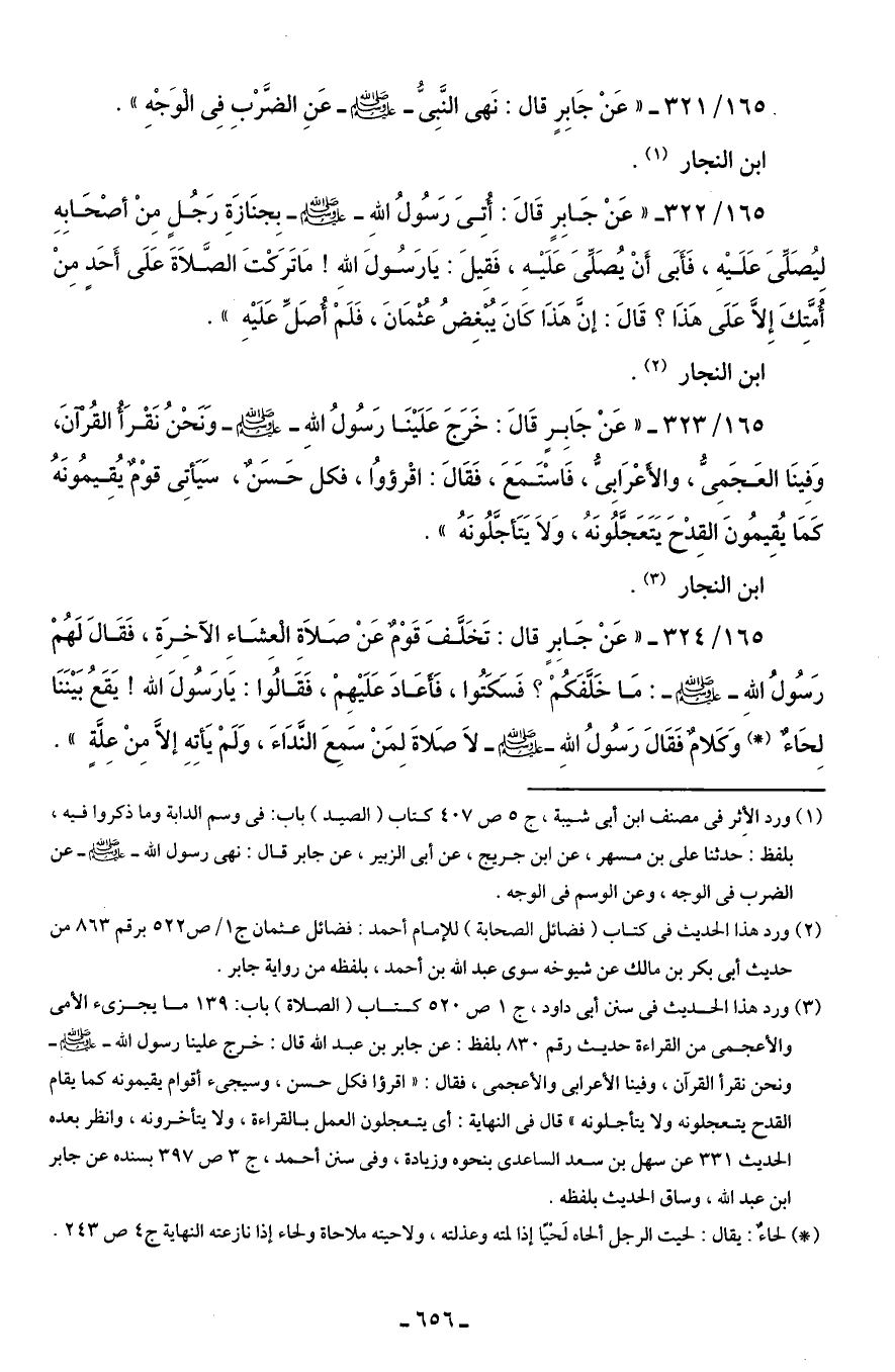 1650/ 321 - "عَنْ جَابِرٍ قال: نَهى النَّبِىُّ - صلى الله عليه وسلم - عَنِ الضَّرْبِ فِى الْوَجْهِ".