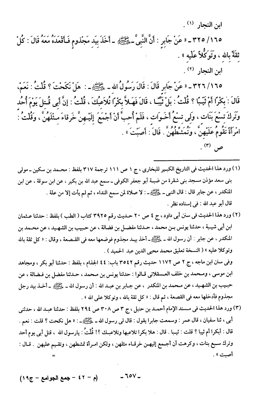 165/ 326 - "عَنْ جَابِر قَالَ: قَالَ رَسُولُ اللهِ - صلى الله عليه وسلم -: هَلْ نَكَحْتَ؟ قُلتُ: نَعَمْ، قَالَ: بِكْرًا أَمْ ثَيّبًا؟ قُلتُ: بَلْ ثِّيبًا، قَالَ فَهَلاَّ بكْرًا تُلاَعِبُكَ، قُلتُ: إنَّ أَبِى قُتِلَ يَوْمَ أُحُدٍ وَتَركَ تِسع بَنَاتٍ، وَلِى تِسع أخَوَاتٍ، فَلَمْ أُحِبَّ أَنْ أجْمَعَ إِلَيْهِنَّ خَرقاءَ مِثْلَهُنَّ، وَقُلتُ: امْرَأَةً تَقُومُ عَلَيْهِنَّ، وَتُمَشِّطُهُنَّ. قَالَ: أَصَبْتَ".