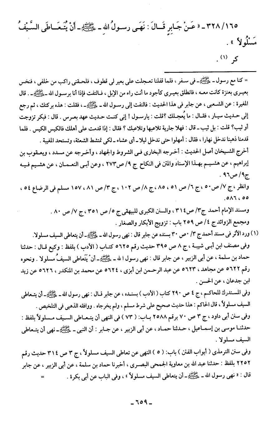 165/ 328 - "عَنْ جَابِر قَالَ: نَهَى رسولُ الله - صلى الله عليه وسلم - أَنْ يُتَعَاطَى السَّيْفُ مَسْلُولًا".