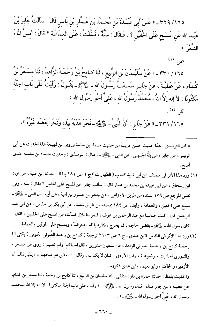 165/ 329 - "عَنْ أَبِى عُبَيْدَةَ بْنِ مُحَمَّد بْنِ عَمَّارِ بْنِ يَاسِر قَالَ: سَأَلْتُ جَابِرَ بْنَ عَبْدِ الله عَنِ المَسْح عَلَى الخُفَّيْنِ؟ ، فَقَالَ: سُنَّةٌ، فَقُلتُ: عَلَى العِمَامَةِ؟ قَالَ: أمِسَّ المَاءَ الشَّعْرَ".