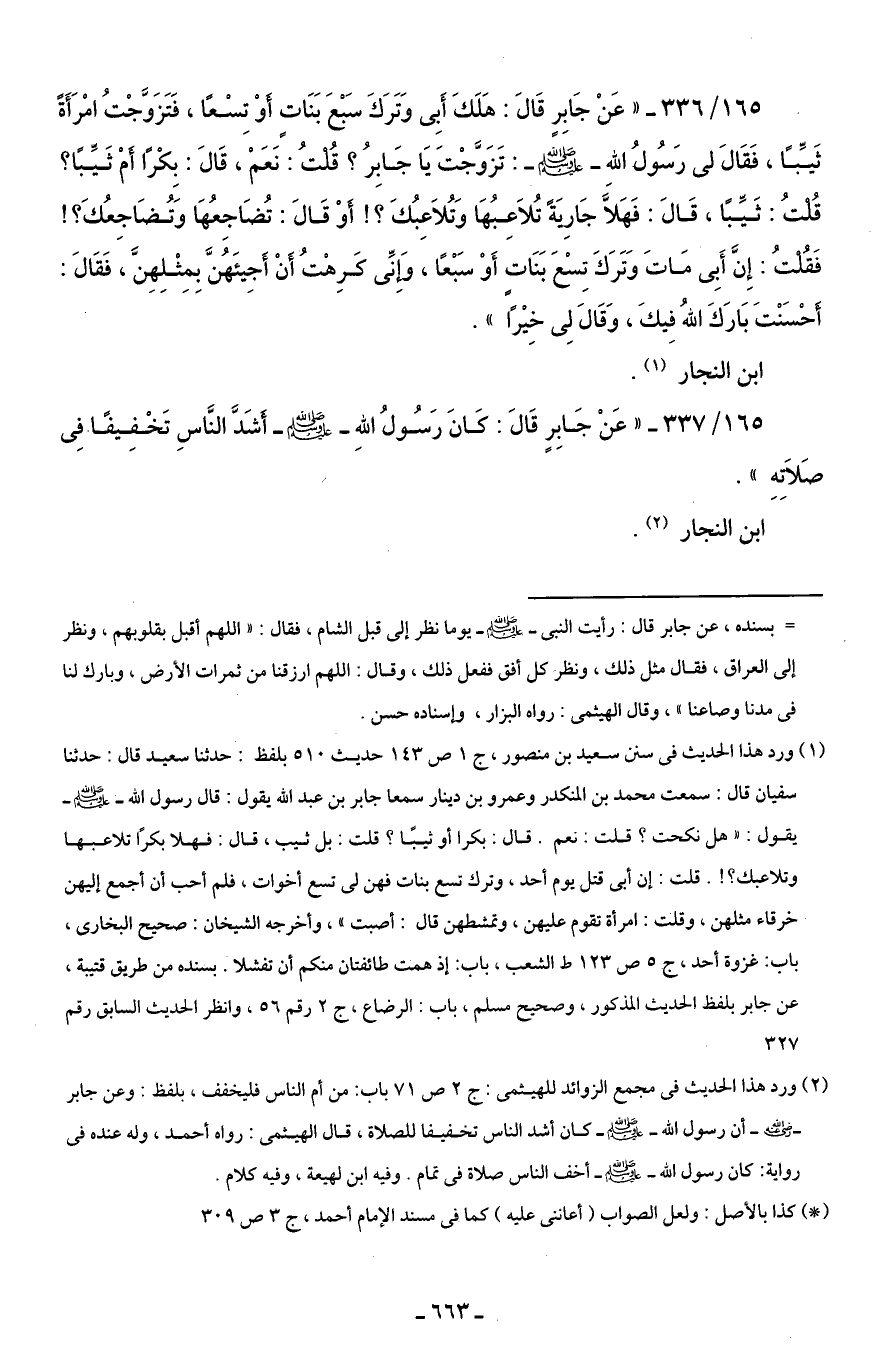 165/ 336 - "عَنْ جَابِرٍ قَالَ: هَلَكَ أَبِى وَتَرَكَ سَبع بَنَات أوْ تِسْعًا، فَتَزَوَّجْتُ امْرَأَةً ثَيِّبًا، فَقَالَ لى رَسُولُ الله - صلى الله عليه وسلم -: تَزَوَّجْتَ يَا جَابِرُ؟ قُلتُ: نَعَمْ، قَالَ: بِكْرًا أَمْ ثَيبًا؟ قُلتُ: ثَيِّبًا، قَالَ: فَهَلاًّ جَارِيَة تُلاَعِبُهَا وَتُلاَعِبُكَ؟ ! أوْ قَالَ: تُضَاجِعُهَا وَتُضَاجِعُكَ؟ ! فَقُلتُ: إِنَّ أَبِى مَاتَ وَتَرَكَ تِسع بَنَات أَوْ سَبْعًا، وَإنِّى كَرِهْتُ أنْ أَجِيئَهُنَّ بِمِثْلِهِنَّ، فَقَالَ: أحْسَنْتَ بَارَكَ الله فِيكَ، وَقَالَ لِى خِيْرًا".