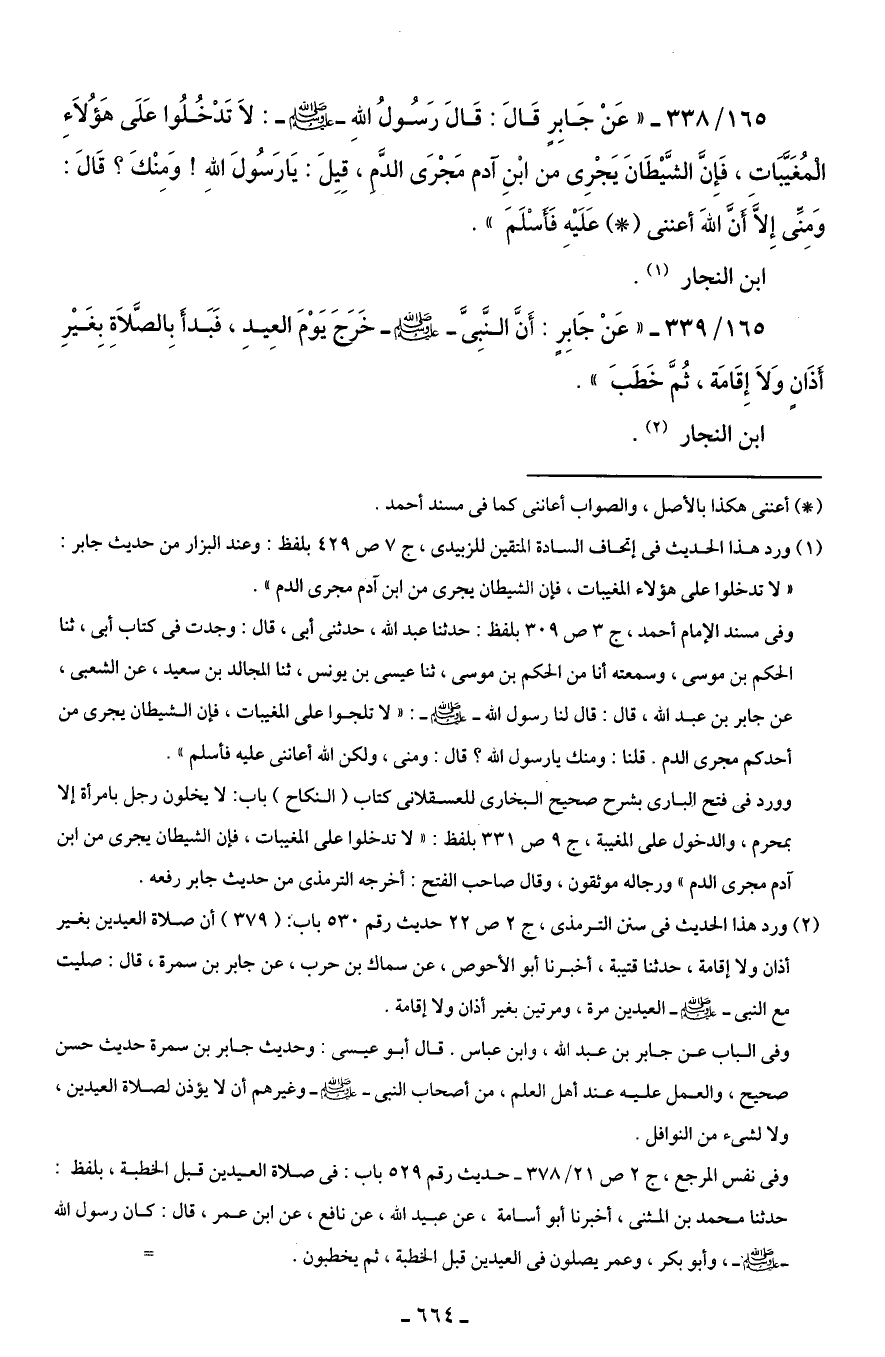 165/ 338 - "عَنْ جَابِرٍ قَالَ: قَالَ رَسُولُ اللهِ - صلى الله عليه وسلم -: لاَ تَدْخُلُوا عَلَى هَؤُلاَءِ الْمُغَيَّبَات، فَإِنِّ الشَّيْطَانَ يَجْرِى من ابْنِ آدم مَجْرَى الدَّمِ، قِيِلَ: يَارَسُولَ اللهِ! وَمِنْكَ؟ قَالَ: وَمِنِّى إِلاَّ أَنَّ اللهَ أعننى (*) عَلَيْهِ فَأسْلَمَ".
