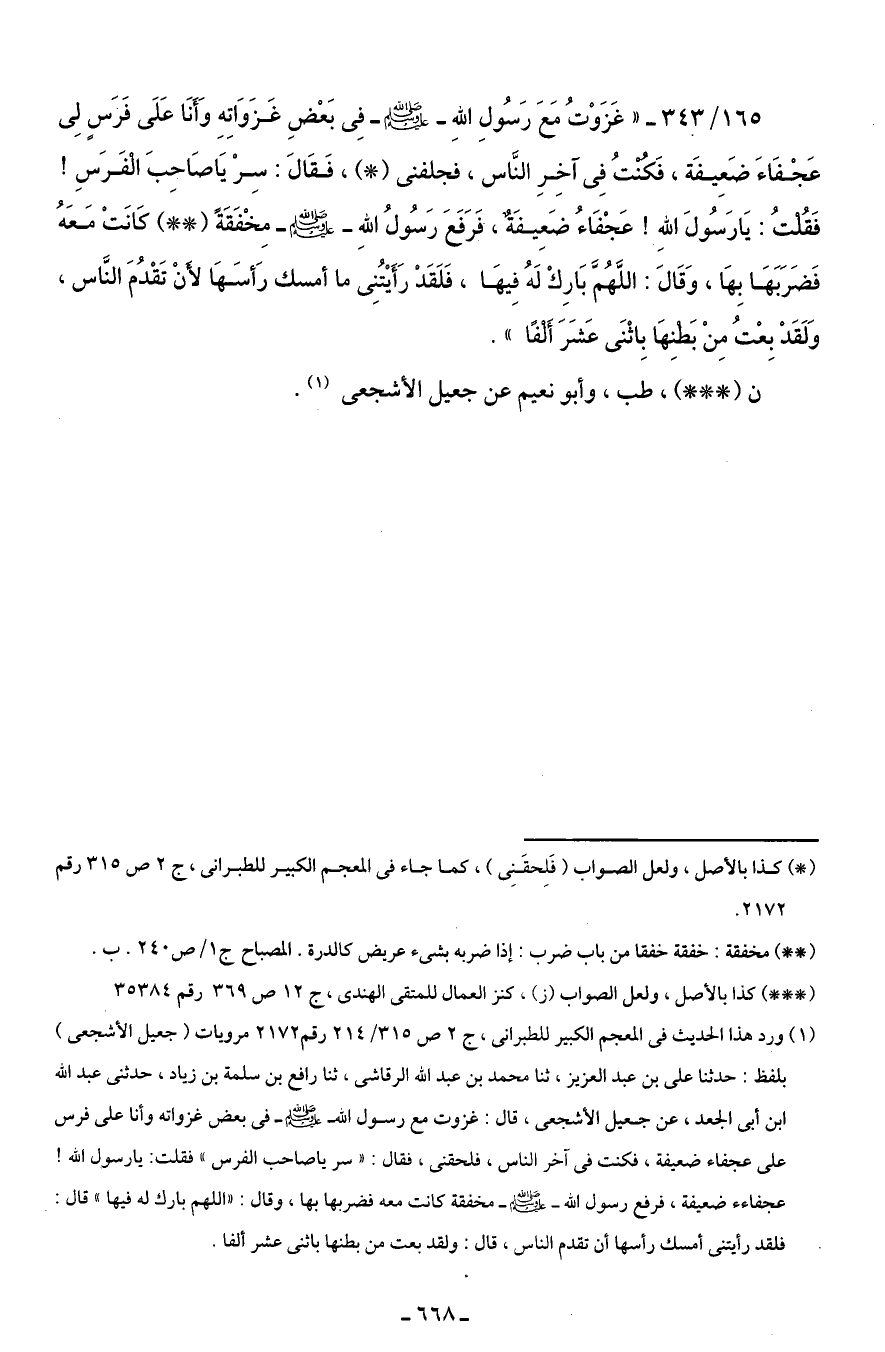 (¬1) ورد هذا الحديث في المعجم الكبير للطبرانى، ج 2 ص 315/ 214 رقم 2172 مرويات (جعيل الأشجعى) بلفظ: حدثنا على بن عبد العزيز، ثنا محمد بن عبد الله الرقاشى، ثنا رافع بن سلمة بن زياد، حدثنى عبد الله ابن أبى الجعد، عن جعيل الأشجعى، قال: غزوت مع رسول - صلى الله عليه وسلم - في بعض غزواته وأنا على فرس على عجفاء ضعيفة، فكنت في آخر الناس، فلحقنى، فقال: "سر يا صاحب الفرس" فقلت: يا رسول الله! عجفاء ضعيفة، فرفع رسول الله - صلى الله عليه وسلم - مخفقة كانت معه فضربها بها، وقال: "اللهم بارك له فيها" قال: فلقد رأيتنى أمسك رأسها أن تقدم الناس، قال: ولقد بعت من بطنها باثنى عشر ألفا.