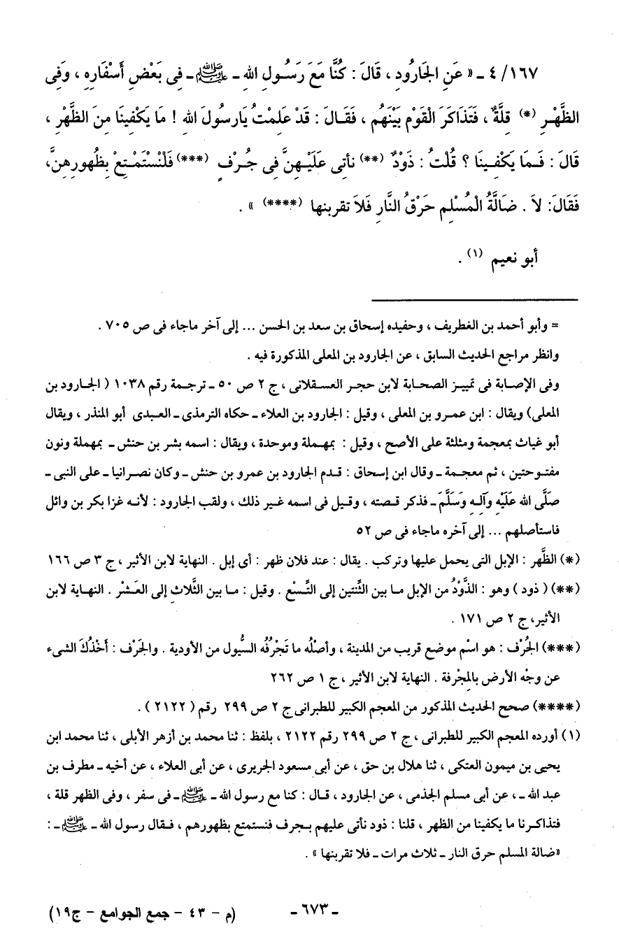 167/ 4 - "عَنِ الجَارُودِ، قَالَ: كُنَّا مَعَ رَسُولِ اللهِ - صلى الله عليه وسلم - فِى بَعْضِ أَسْفَارِهِ، وَفِى الظَّهْرِ (*) قِلَّة، فَتَذَاكَرَ الْقَوْم بَيْنَهُم، فَقَالَ: قَدْ عَلِمْتُ يَارسُولَ اللهِ! مَا يَكْفِينَا مِنَ الظَّهْرِ، قَالَ: فَمَا يَكْفِينَا؟ قُلتُ: ذَوْدٌ (* *) نأتِى عَلَيْهِنَّ فِى جُرْفٍ (* * *) فَلنْسْتَمْتِعْ بِظُهورِهِنَّ، فَقَالَ: لاَ. ضَالَّةُ الْمُسْلِم حَرْقُ النَّارِ فَلاَ تقربنها (* * * *) ".