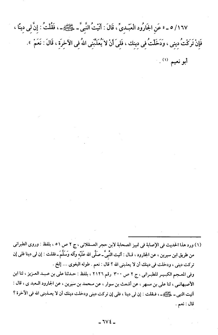 167/ 5 - " عَنِ الجَارُود الْعَبْدِىِّ، قَالَ: أتَيْتُ النَّبِىَّ - صلى الله عليه وسلم -، فَقُلْتُ: إِنَّ لِى دِينًا، فَإِنْ تَرَكْتُ دِينِى، وَدَخَلْتُ فِى دِينِك، فَلِىَ أَنْ لاَ يُعَذِّبَنِى الله فِى الآخِرَةِ، قَالَ: نَعَمْ ".