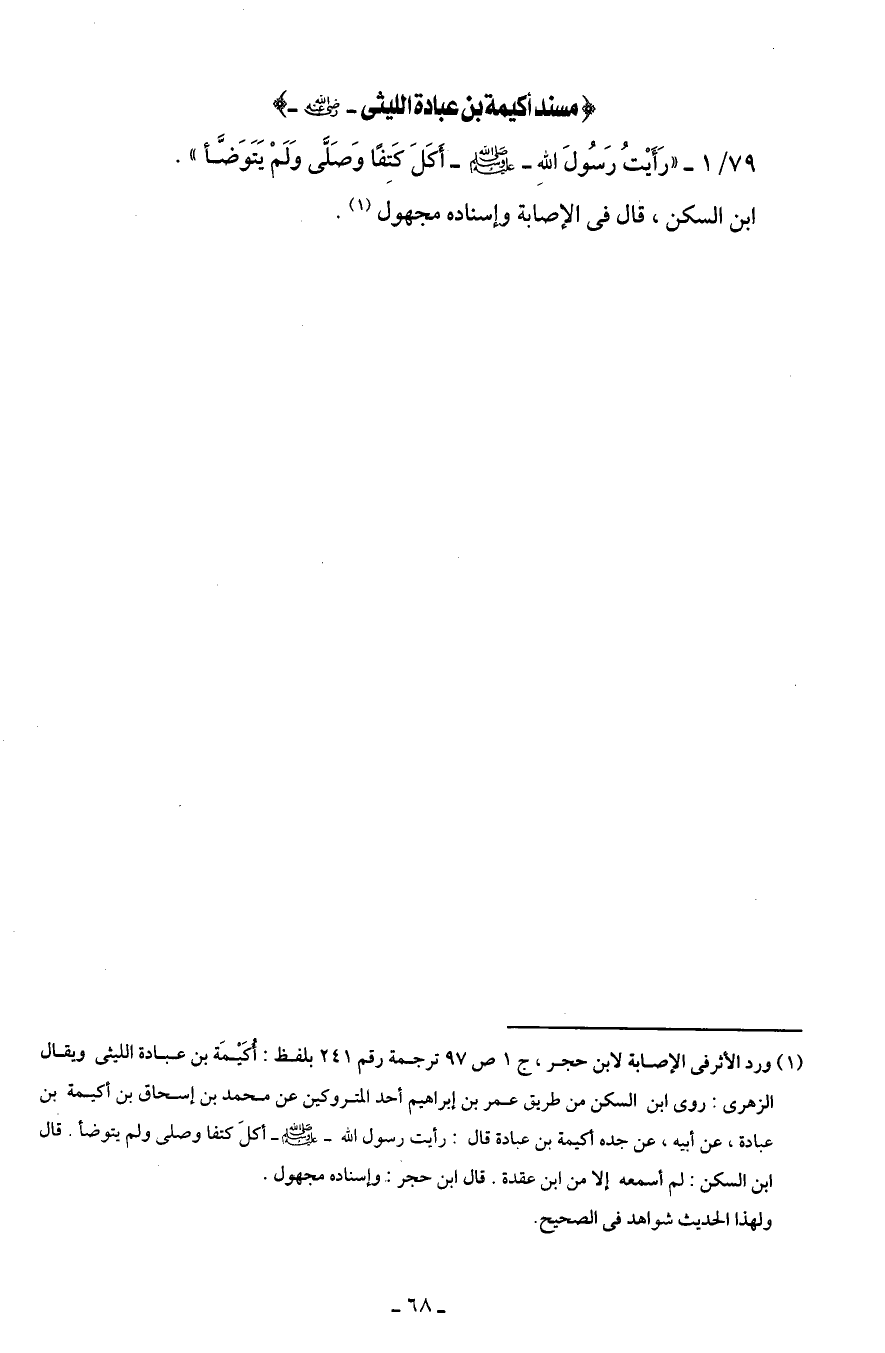 (¬1) ورد الأثر في الإصابة لابن حجر، ج 1 ص 97 ترجمة رقم 241 بلفظ: أُكَيْمَة بن عبادة الليثى ويقال الزهرى: روى ابن السكن من طريق عمر بن إبراهيم أحد المتروكين عن محمد بن إسحاق بن أكيمة بن عبادة، عن أبيه، عن جده أكيمة بن عبادة قال: رأيت رسول الله - صلى الله عليه وسلم - أكلَ كتفا وصلى ولم يتوضأ. قال ابن السكن: لم أسمعه إلا من ابن عقدة. قال ابن حجر: - وإسناده مجهول.