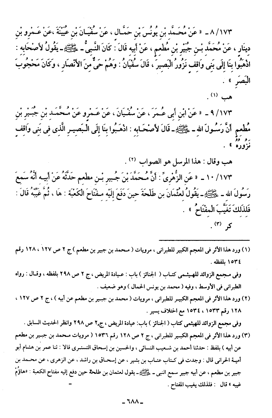 173/ 9 - "عَنْ ابْنِ أَبِى عُمَرَ، عَنْ سُفْيَانَ، عَنْ عَمْرٍو عَنْ مُحَّمَدِ بْنِ جُبَيْرِ بْنِ مُطْعِمٍ أَنَّ رَسُولَ اللهِ - صلى الله عليه وسلم - قَالَ لأَصْحَابِهِ: اذْهَبُوا بِنَا إِلَى الْبَصِيرِ الَّذِى فِى بَنِى وَاقِفٍ نَزُورُهُ".