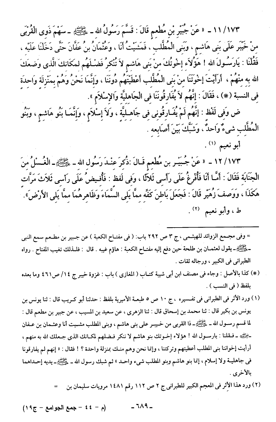 173/ 11 - "عَنْ جُبَيْرِ بْنِ مُطْعِمٍ قَالَ: قَسَّمَ رَسُولُ اللهِ - صلى الله عليه وسلم - سَهْمَ ذَوِى الْقُرْبَى مِنْ خَيْبَر عَلَى بَنِى هَاشِمٍ، وَبَنِى الْمُطَّلبِ، فَمَشَيْتُ أَنَا، وَعُثْمَانُ بنُ عَفَّانَ حَتَّى دَخَلْنَا عَلَيْهِ، فَقُلْنَا: يَا رَسُولَ اللهِ! هَؤُلَاءِ إِخْوتُكَ مِنْ بَنِى هَاشِمٍ لَا تُنْكِرُ فَضْلَهُم لِمَكَانِكَ الَّذِى وَضعَكَ الله بِهِ مِنْهُمْ، أَرَأَيْتَ إخْوَتَنَا مِنْ بَنِى الْمُطَّلِب أَعْطَيْتَهُم دُونَنَا، وَإنَّمَا نَحْنُ وَهُمْ بِمَنْزِلَةٍ وَاحِدَةٍ فِى النسبة (*)، فَقَالَ: إِنَّهُم لَا يُفَارِقُونَنَا فِى الْجَاهِلِيَّةِ وَالإِسْلَامِ".