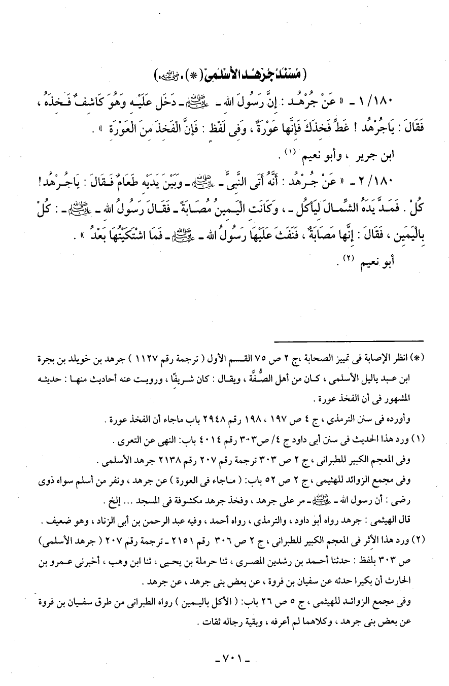 (*) انظر الإصابة في تمييز الصحابة، ج 2 ص 75 القسم الأول (ترجمة رقم 1127) جرهد بن خويلد بن بجرة بن عبد ياليل الأسلمى، كان من أهل الصُّفَّة، ويقال: كان شريفًا، ورويت عنه أحاديث منها: حديثه المشهور في أن الفخذ عورة.